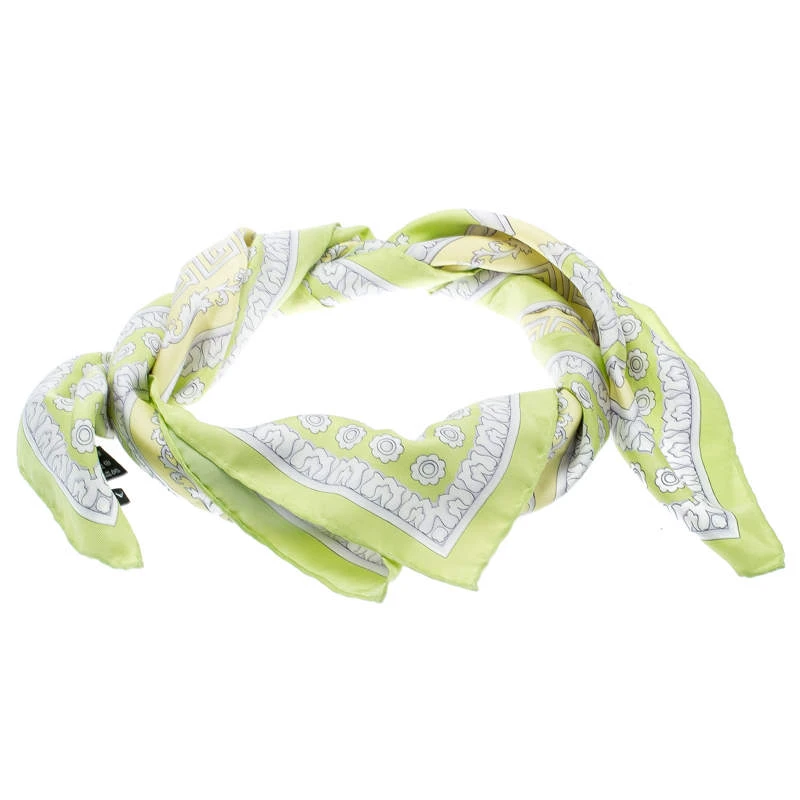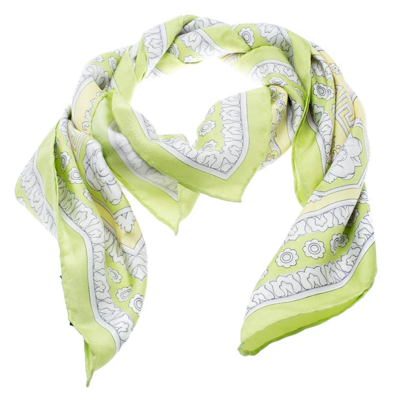 Add a touch of interest to a simple outfit with this Versace scarf. Made from 100% silk, it features lime green floral baroque print and neatly hemmed edges.