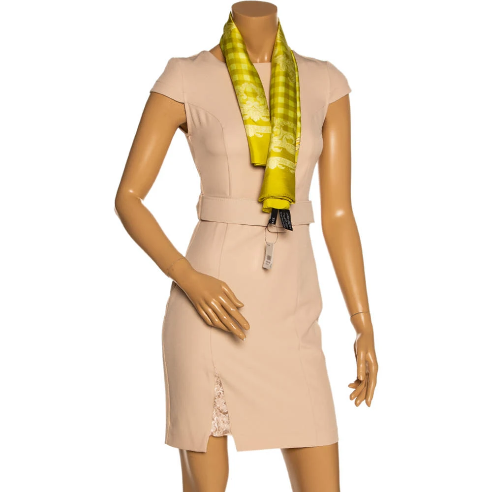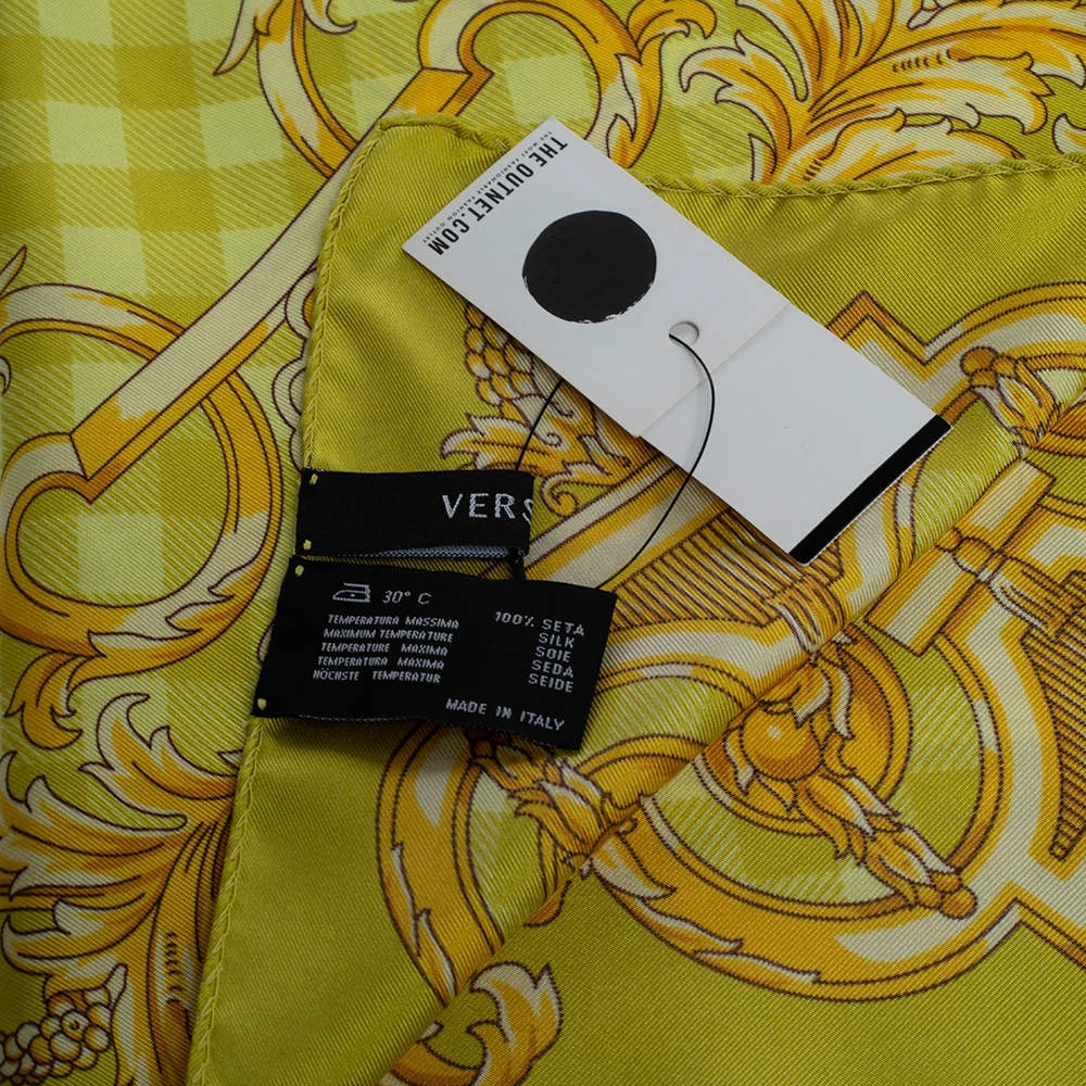 This lime green Versace scarf will lend a luxurious touch to your outfits and makes for a perfect accessory. It is made of 100% silk and styled with a beautiful design that is detailed with the signature Medusa motif. It carries a neatly stitched brand label at the back.