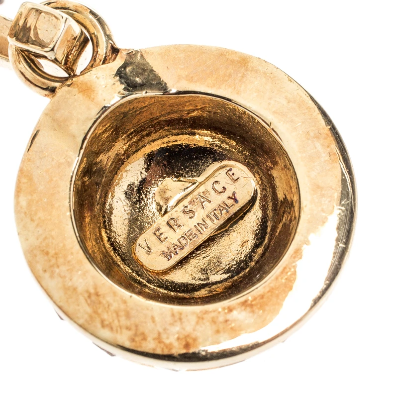 Perfect to create an instantly glamorous and sleek look, these Versace drop earrings are sure to stand out with your special looks. Constructed in gold-tone metal, these earrings have signature Medusa-shaped drops that come encrusted with crystals. The pair definitely stands out.
