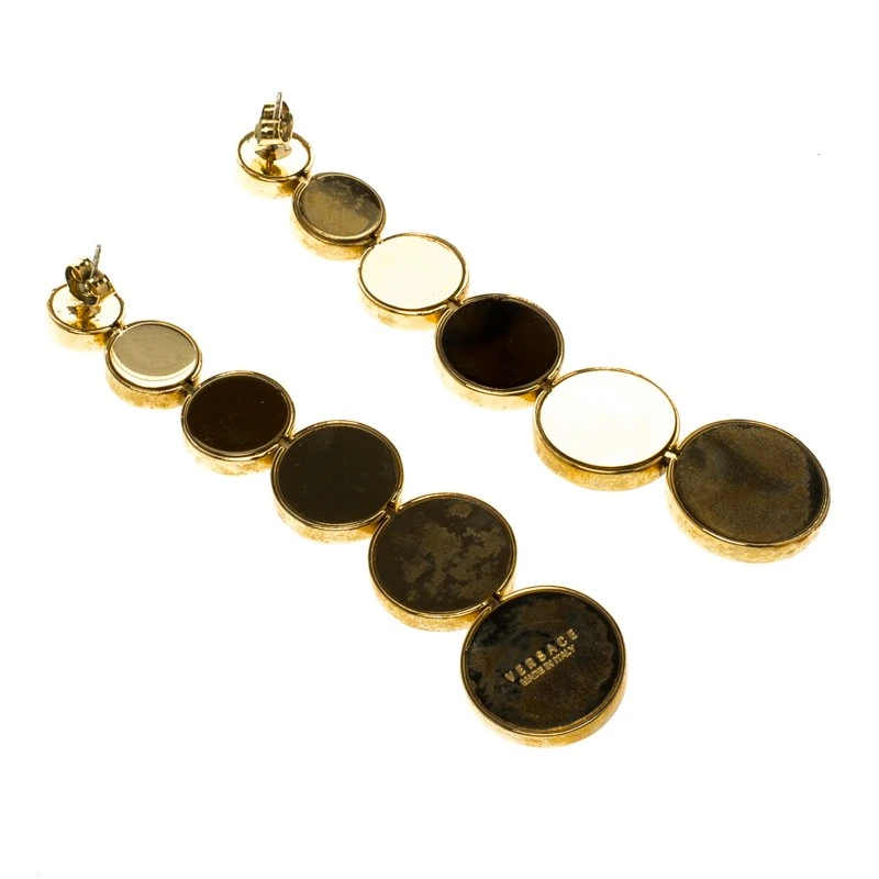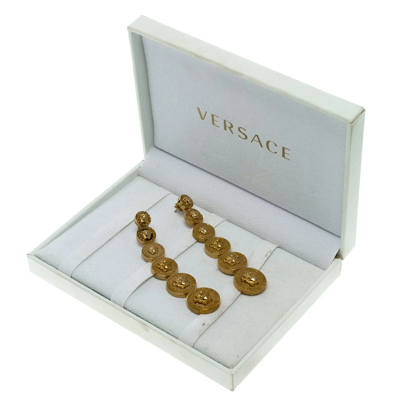 Earrings are a perfect accessory to complete an outfit. Made in Italy, these Versace earrings are feminine and modish. Crafted in gold-tone metal, the pair carries the famous Medusa engravings arranged in a stacked array. These pretty earrings are just the perfect accessory to add an elegant yet contemporary touch to your look.