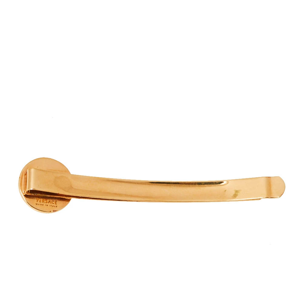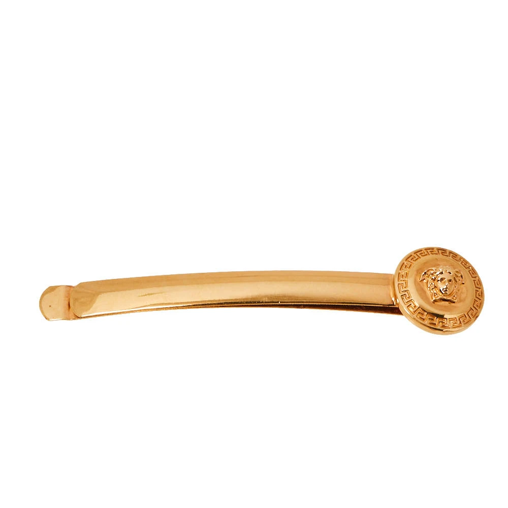 Versace reworks its signature Medusa head in coin motif to create this hair clip. It’s made from gold-tone metal with a Greek meander pattern engraved outside the plaque, then set on a curved slide frame. Let it bring a note of exuberant Italian glamour to weekend ensembles.