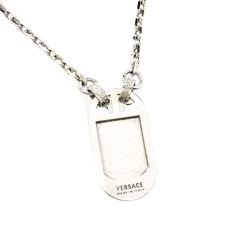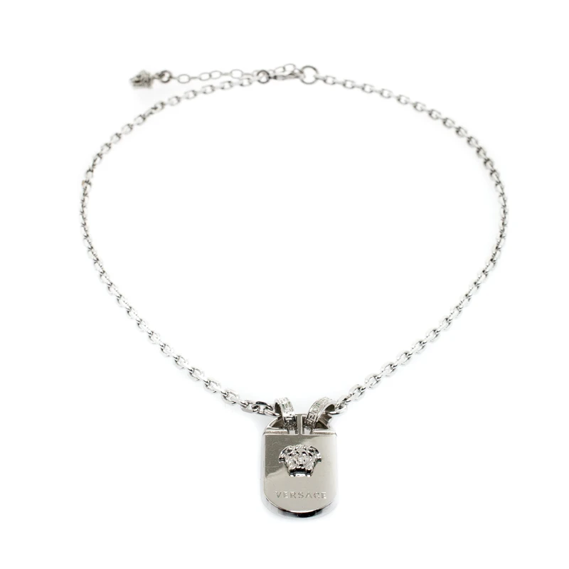 Versace’s use of the Medusa is seen not only in clothes and shoes but also in the brand’s line of accessories. Carrying the very signature is this necklace sculpted from silver-tone metal. The chain holds a tag with the brand name and the Medusa detail.