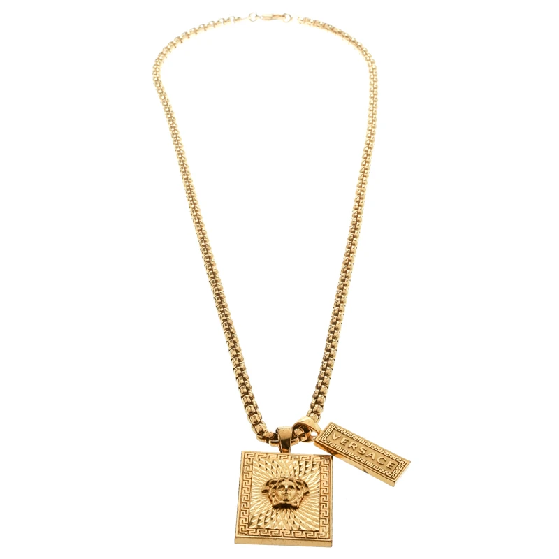 Accessorize your bold looks with this engaging and striking necklace from Versace. The dapper piece is crafted from gold tone metal and features the brand’s signature Medusa pendant in a square shape and a small rectangle-shaped Versace-engraved pendant. It comes with a chunky interlocking chain and a lobster clasp. Wear this exquisite creation with everything, from leather pants to cool t-shirts and suits.