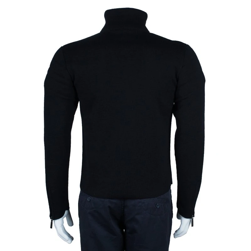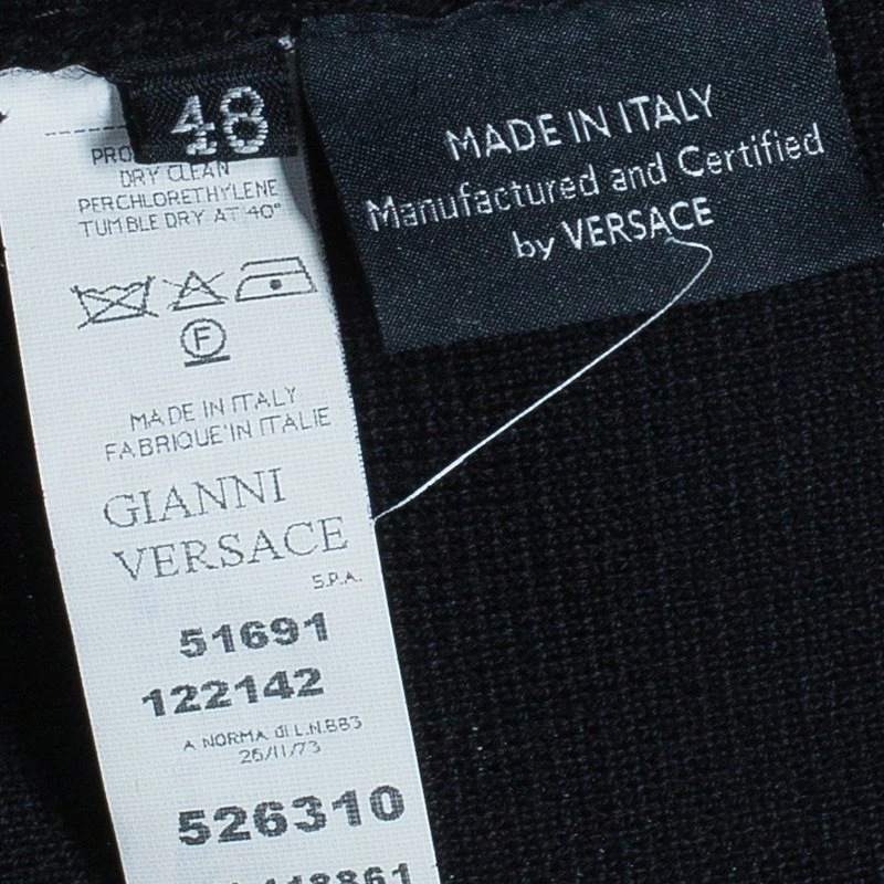 Woven in a turtle neck with three buttons, this pullover from the house of Versace, looks simply versatile and masculine. Crafted from wool leather and elastane blend, it features full sleeves and a turtle neck. Complement it with casual or formal wear. It is a must-have addition to your daily wardrobe for an effortless styling.