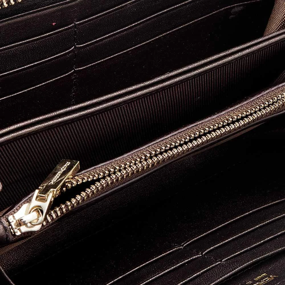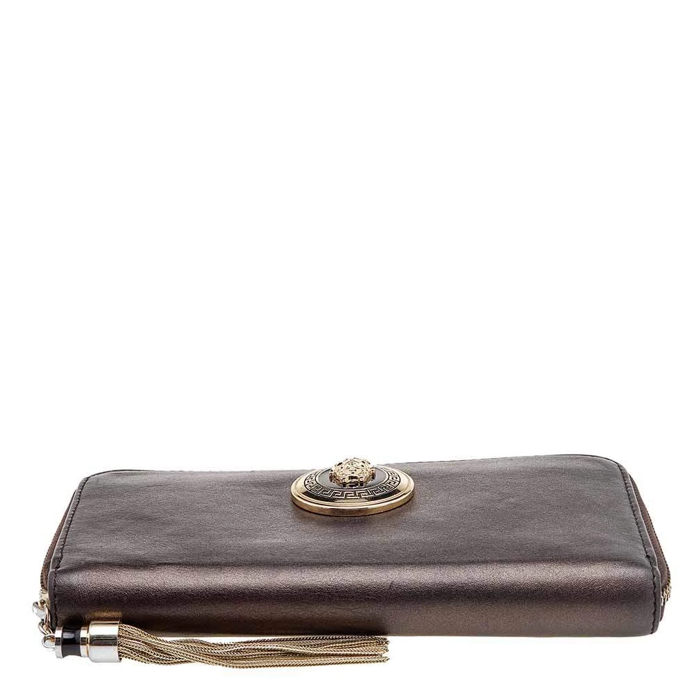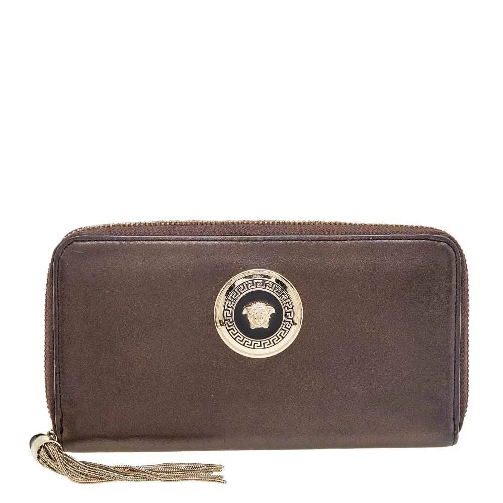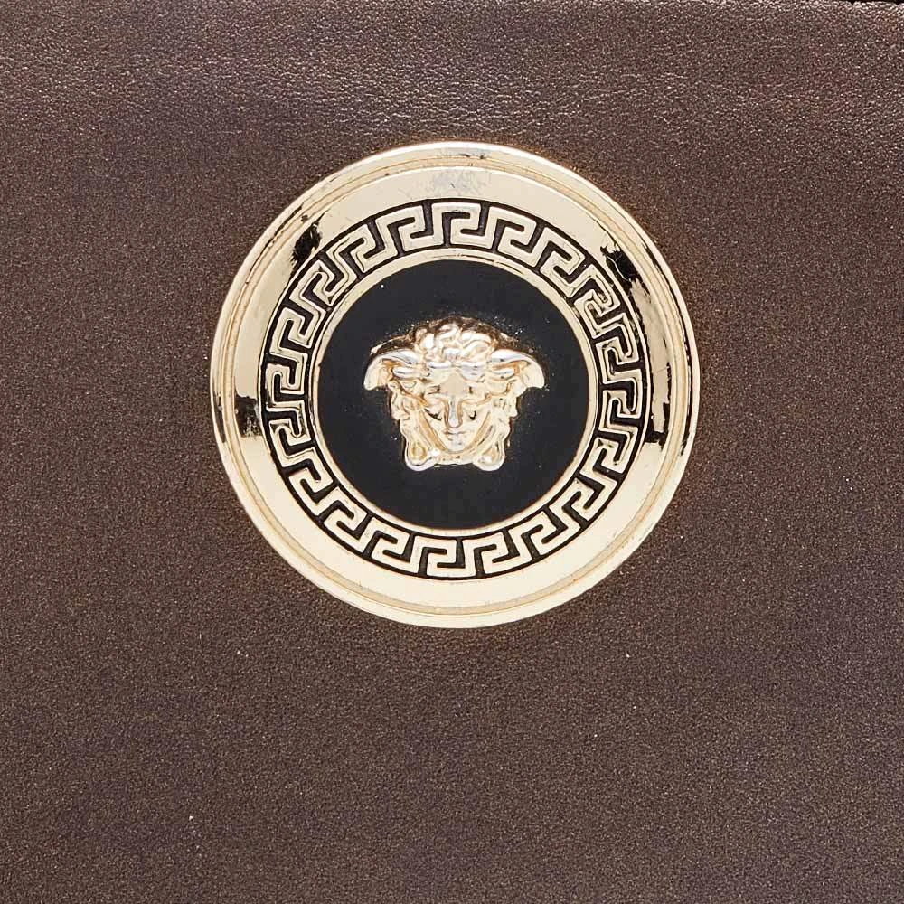 Keep your everyday belongings safe in this wallet from the House of Versace. It is designed using metallic-brown leather, with a Medusa motif perched on the front. It features a well organized fabric-leather interior and gold-tone hardware. Add this stunning accessory to your collection now.