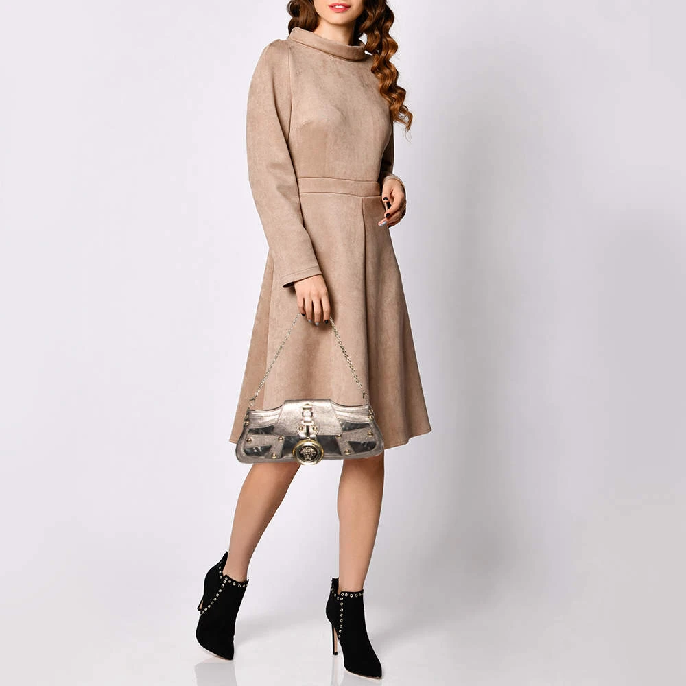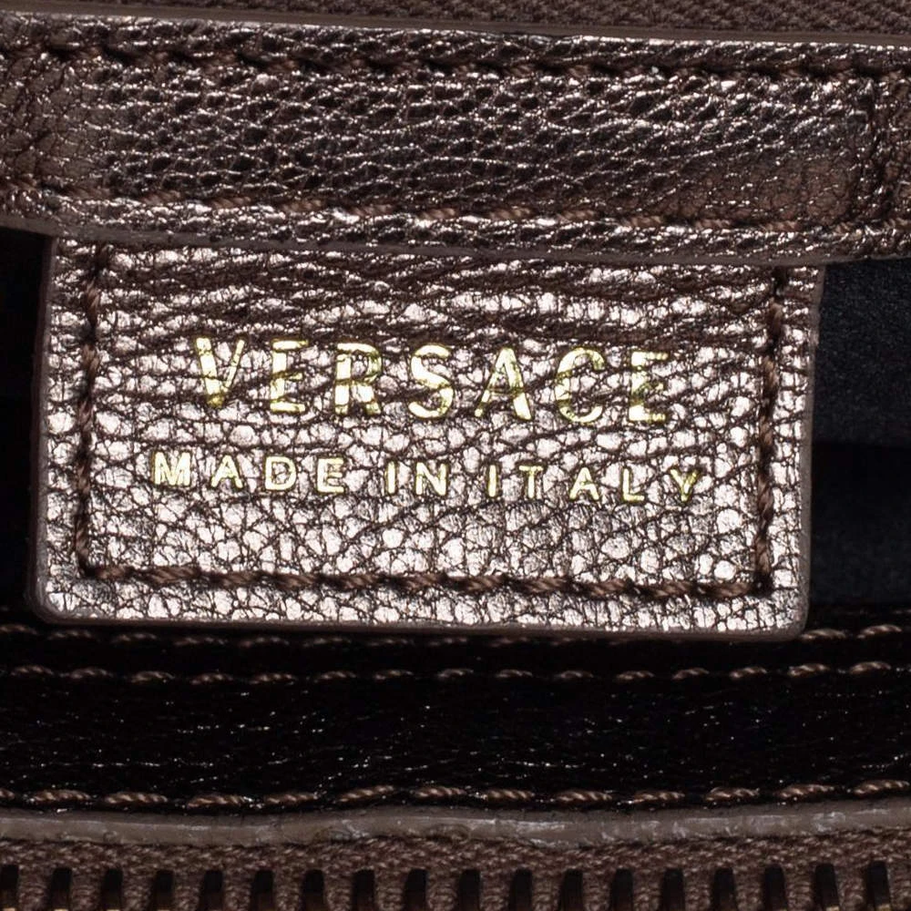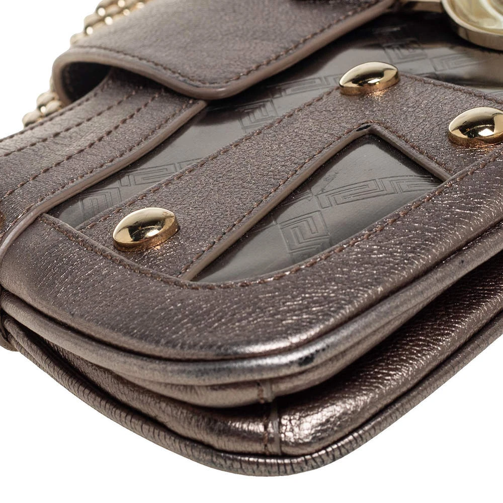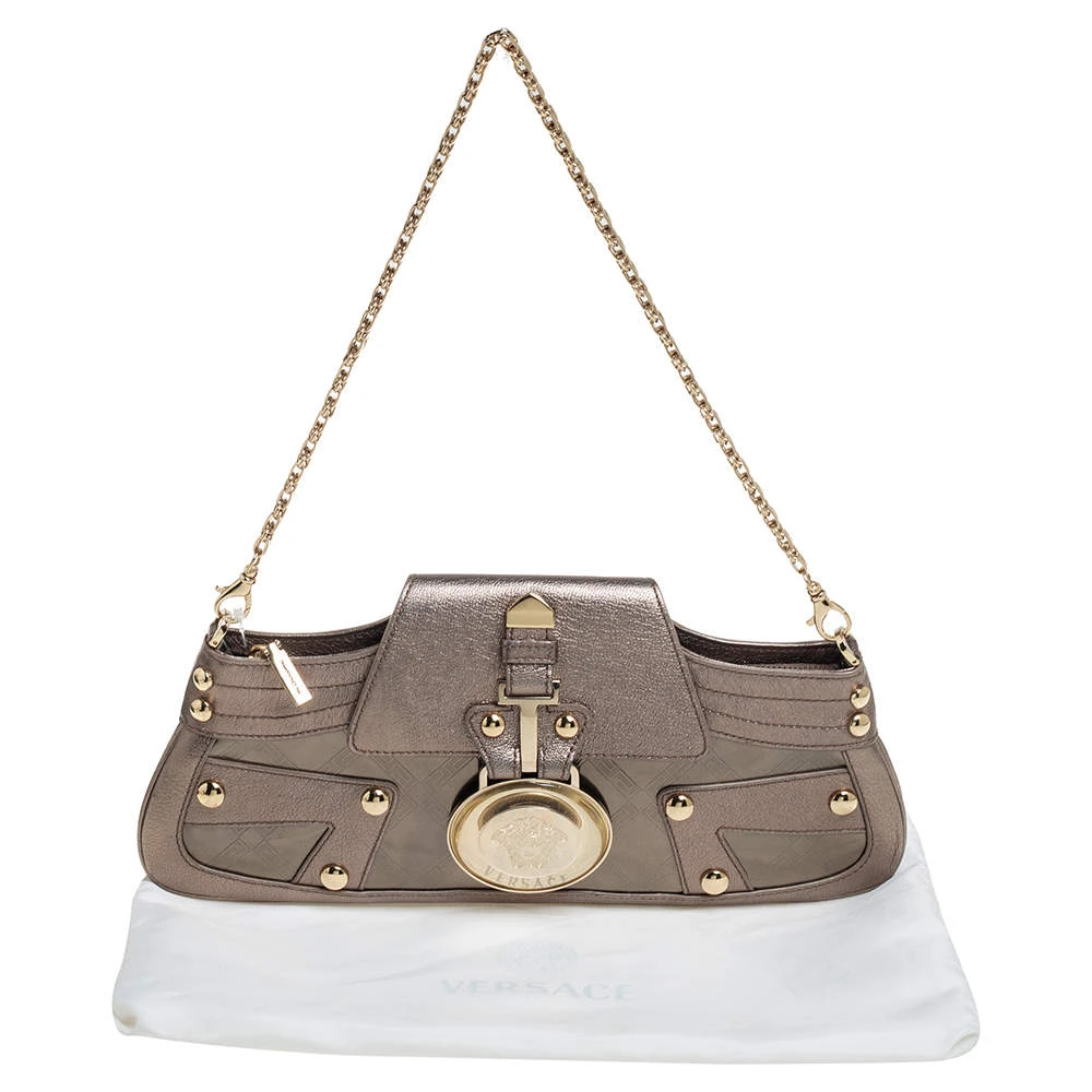 Pick this covetable Versace clutch and make a valuable addition to your closet. The label’s Medusa logo in gold-tone hardware sitting on the metallic exterior is the winning feature of this clutch. Made from embossed leather, it is equipped with a flap and a chain shoulder strap.