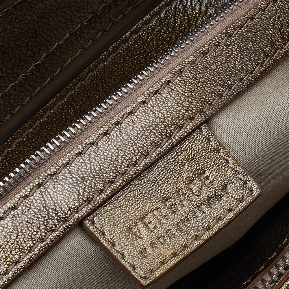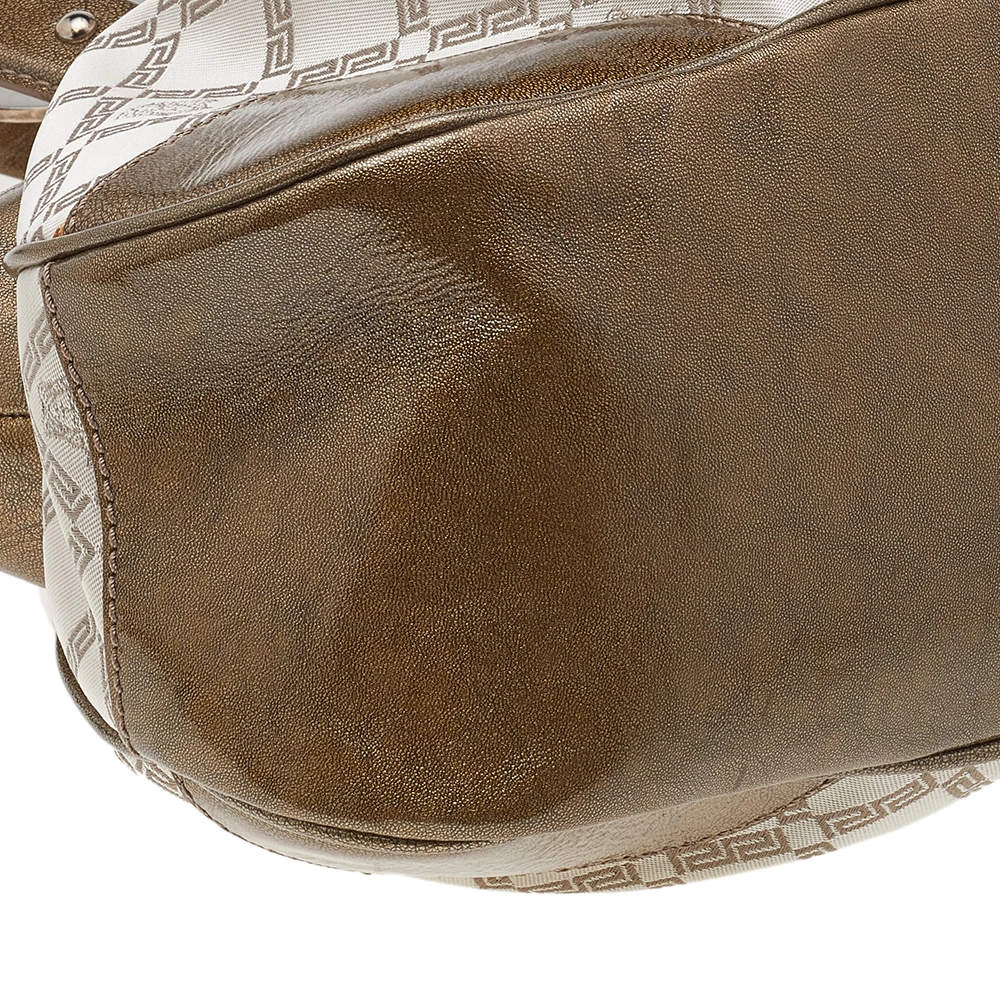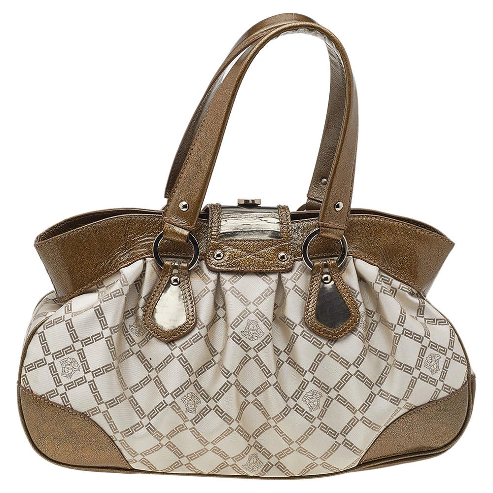 The Madonna bag from Versace is made from canvas and metallic leather. It comes with two handles, gold-tone hardware, and a logo charm on the front. It is lined with satin on the inside and will easily hold your necessities.