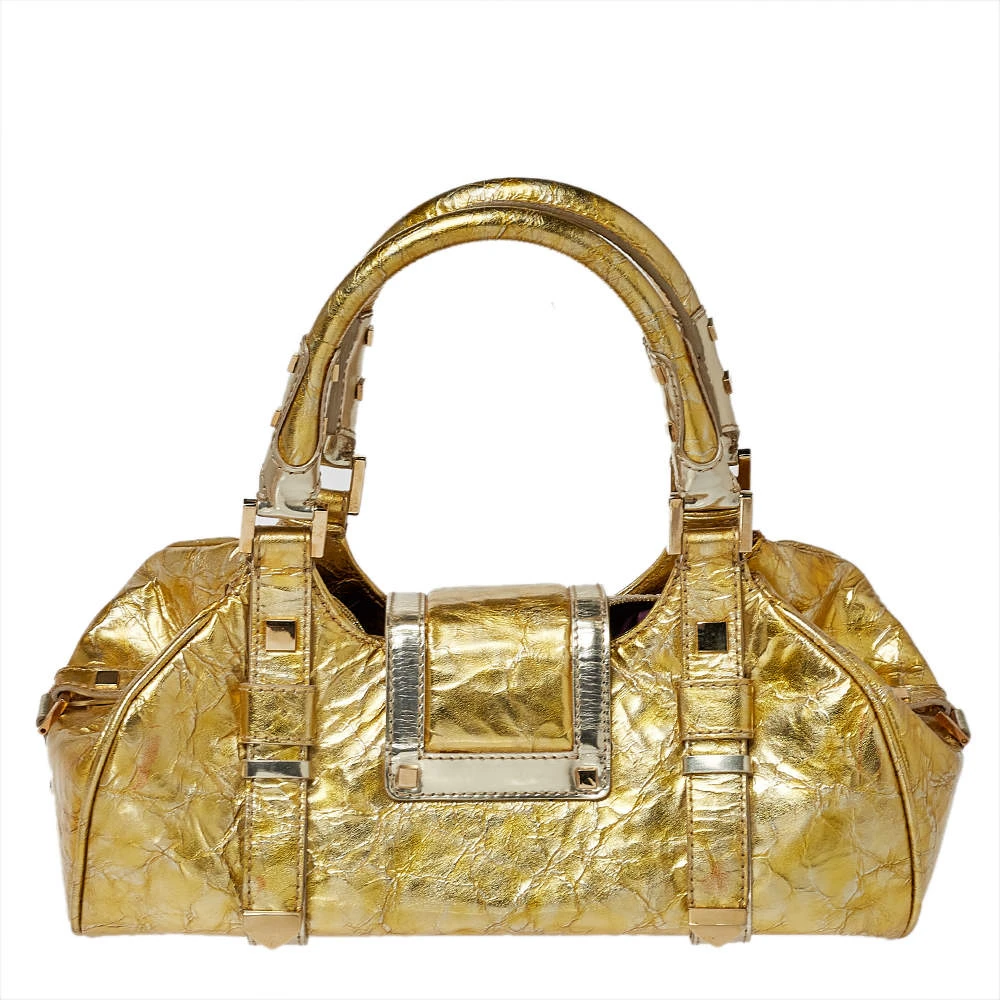 This Versace crinkled leather satchel has an alluring design. Beautifully crafted, the bag comes with a highly durable exterior, a spacious satin interior, two handles, and gold-tone hardware. The creation is ideal for daily use.