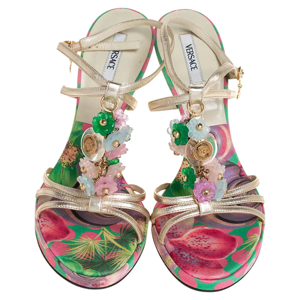 The house of Versace brings to you elegance wrapped in a chic look. These high heel sandals, designed in a T-strap style, come with floral detailing on the uppers and delicate ankle straps that make sure you get a comfortable fit.