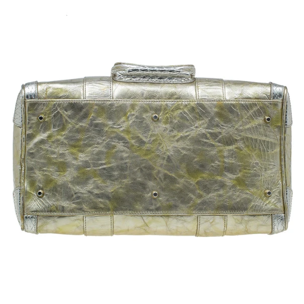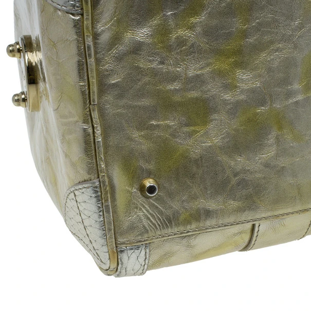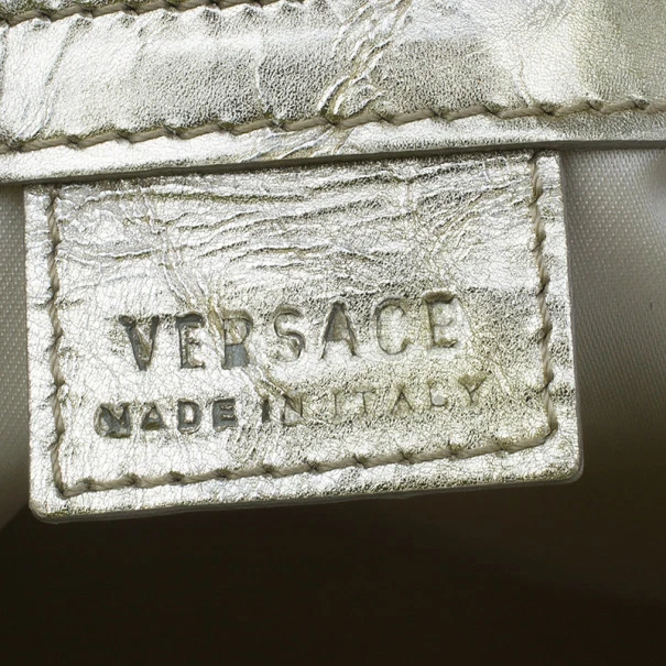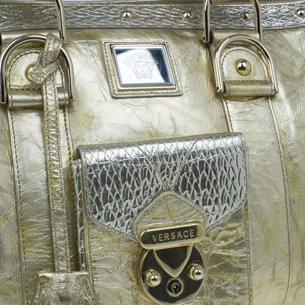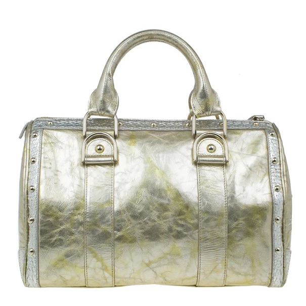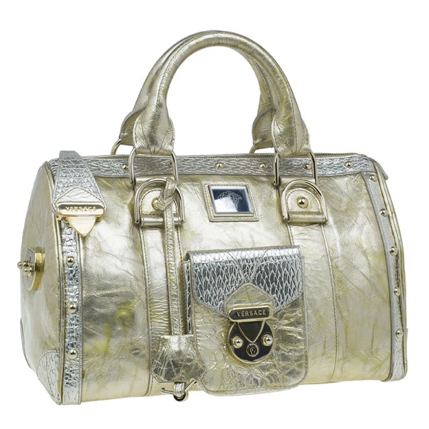 Unleash the diva in you and grab this Versace gold metallic Snap Out Of It boston bag! It is so edgy and chic, and will definitely turn heads everywhere. It features gold-tone metallic pebble-grained leather, matching gold-tone hardware and rolled leather top handles. It also features metal studs lining the bag and a side pocket.