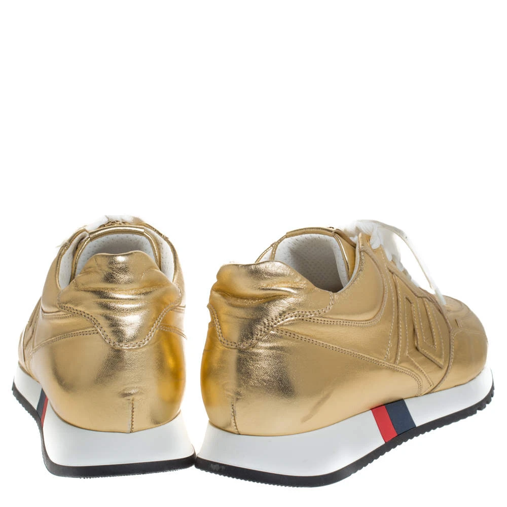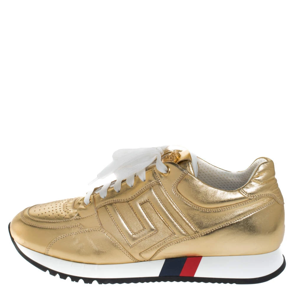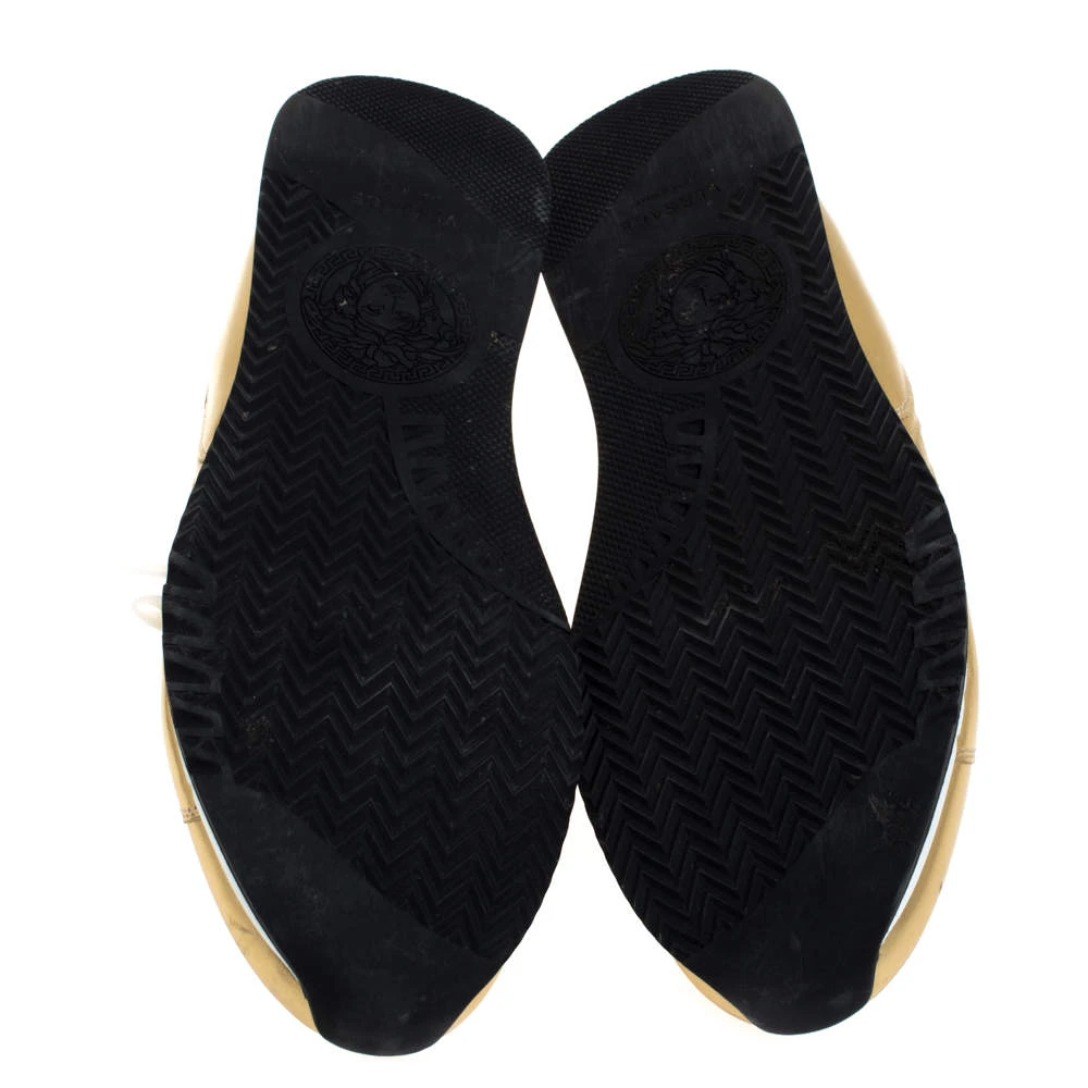 Make these stylish leather sneakers yours this season. The trendy and chic sneakers from Versace will lift up your style in an effortless way. They come in metallic gold, featuring lace-up vamps and durable rubber soles.