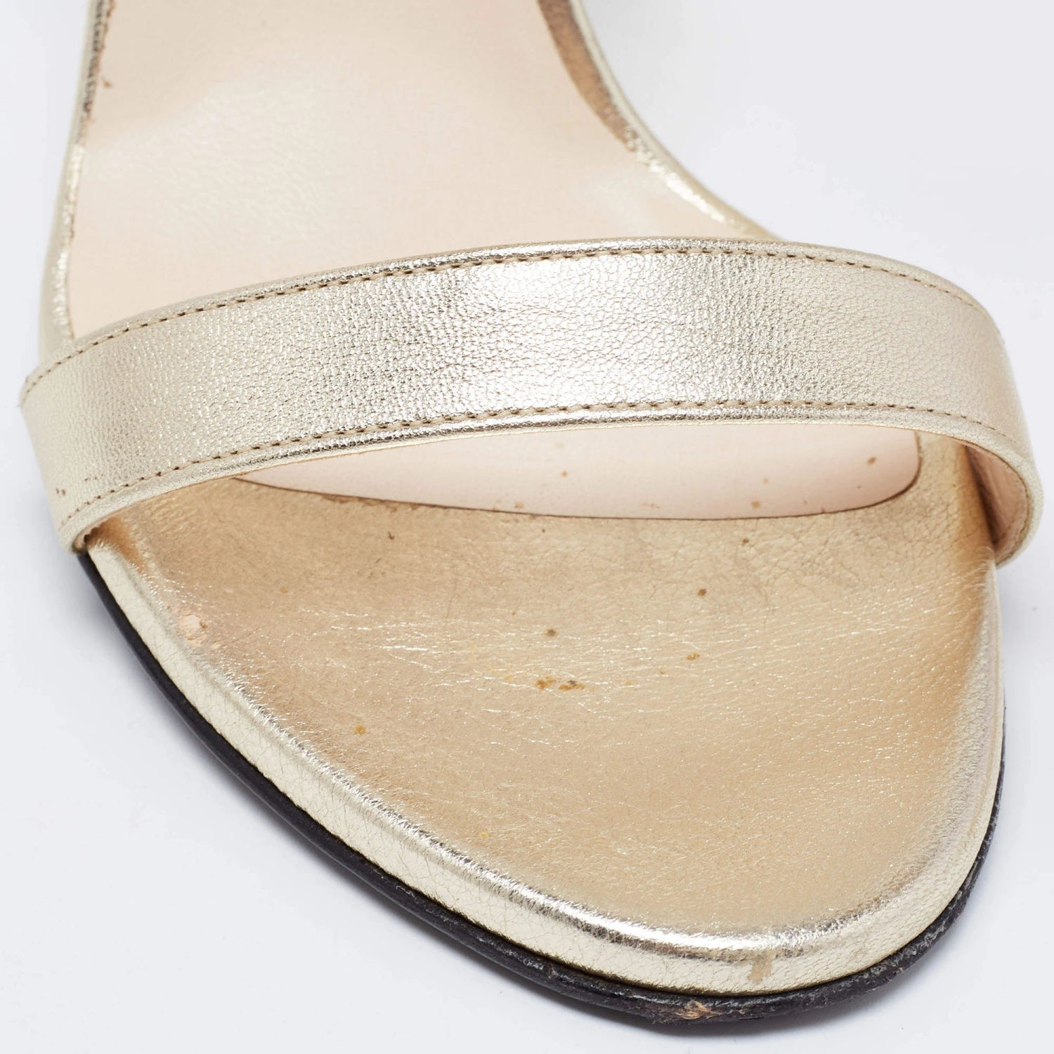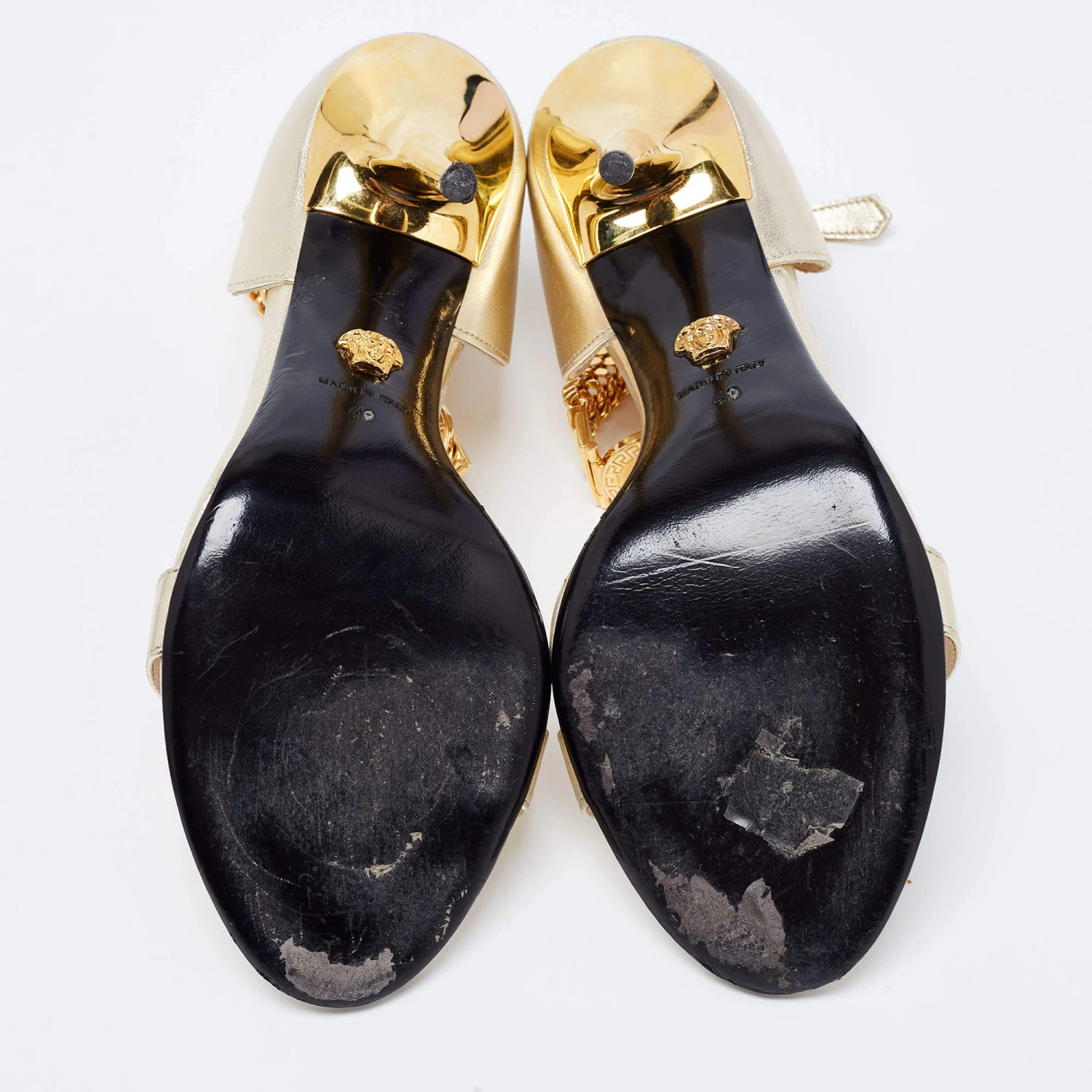 This pair of sandals by Versace delivers sophistication. The shoes come made from leather in a classy shade of metallic gold and are designed with open toes and 12 cm heels.