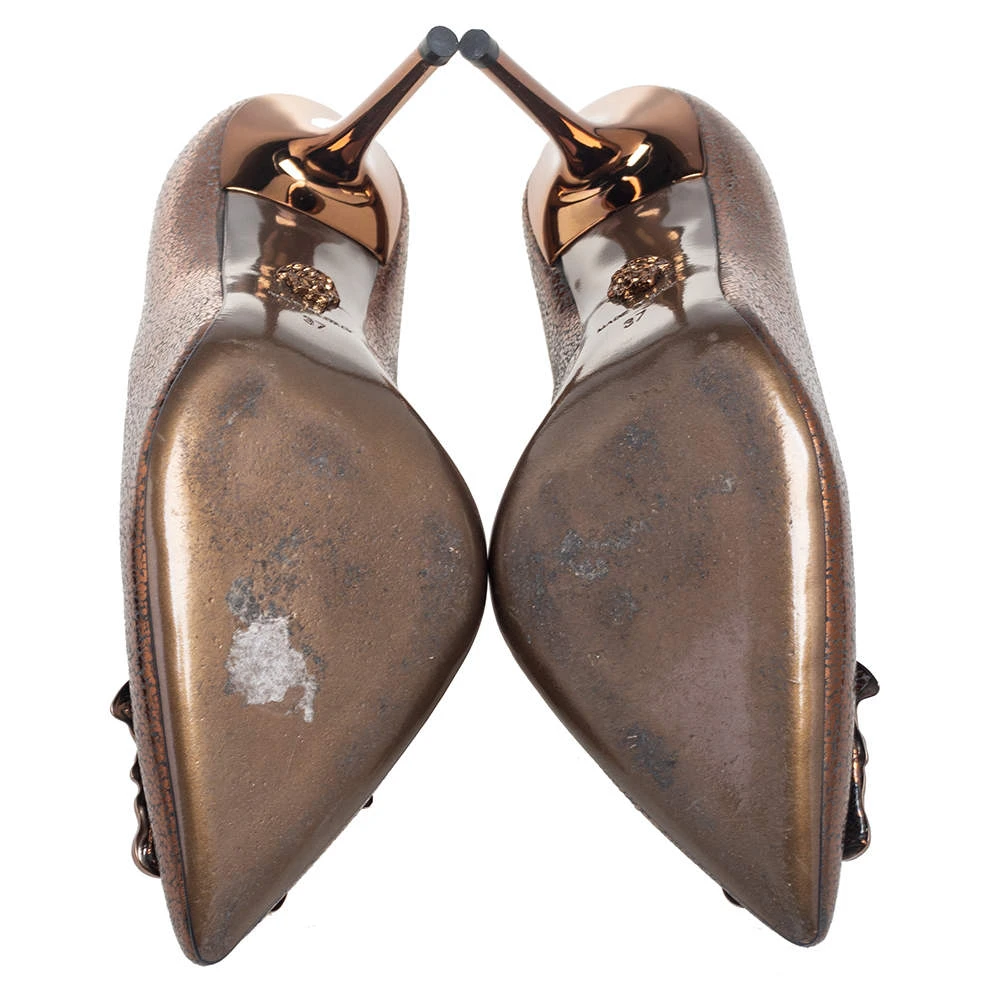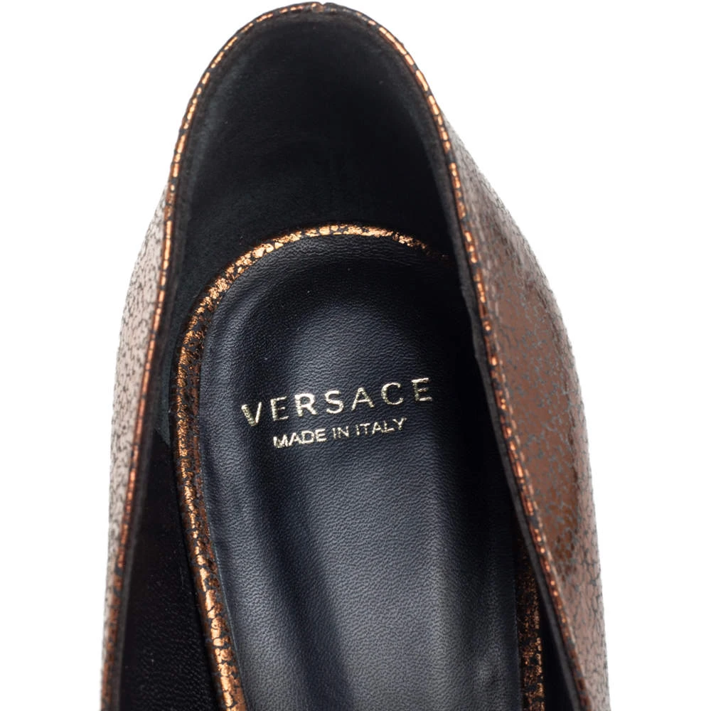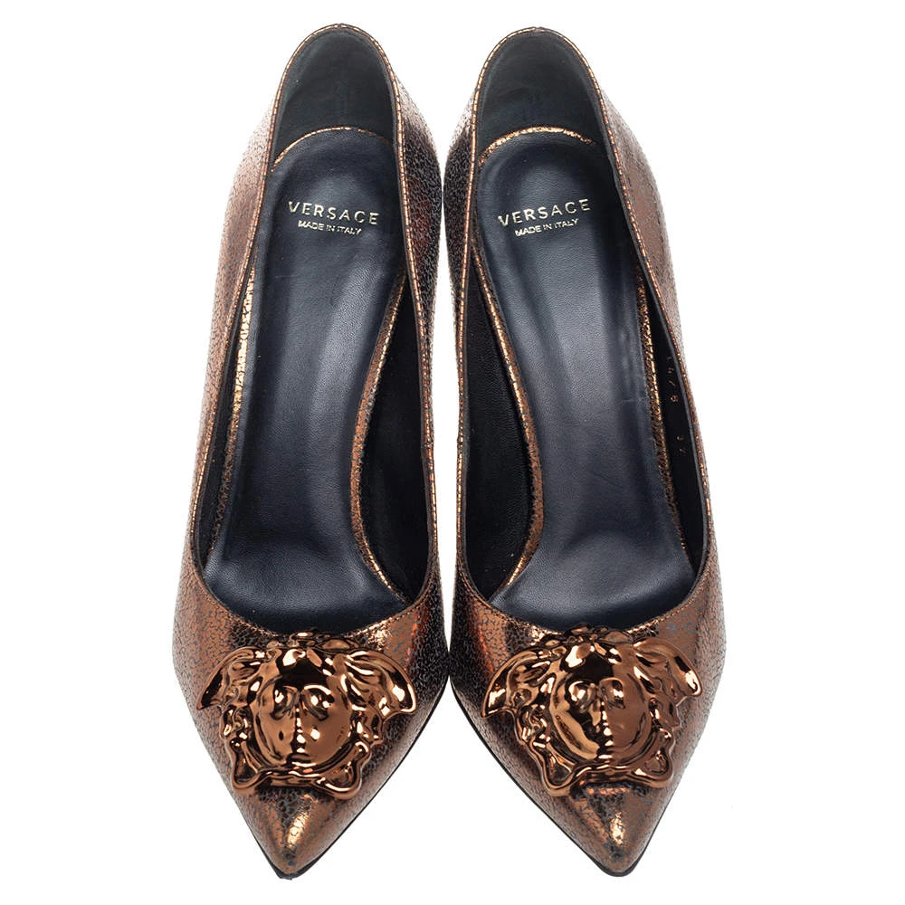 This pair of Versace pumps are a style statement with a timeless design. Crafted from gold textured-leather, they feature pointed toes accented with the iconic Medusa motif in gold-tone metal, 10 cm heels and leather soles. They bring a touch of glamour to every outfit they are paired with.