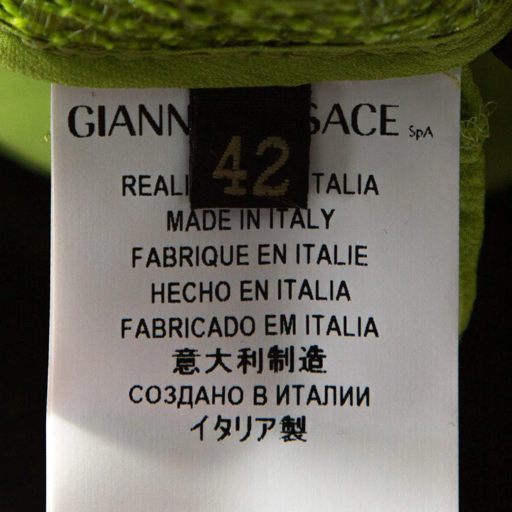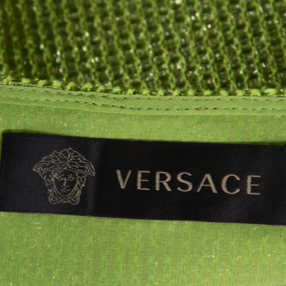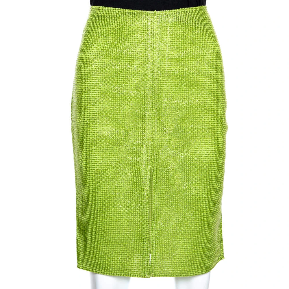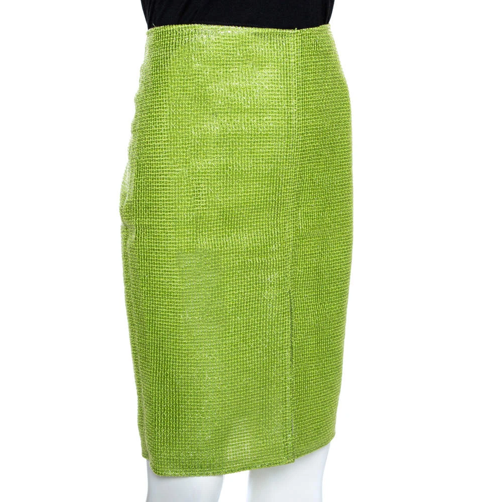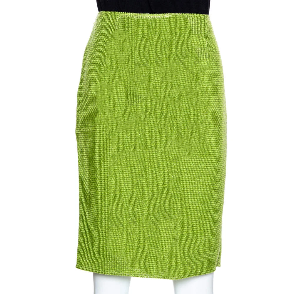 This stunning pencil skirt comes from the iconic house of Versace. it has been crafted from a cotton-blend and has an interwoven metallic green exterior. it has been designed to exude style and effortless sophistication. It has a front slit, zip closures, fitted silhouette and a tailored fit.