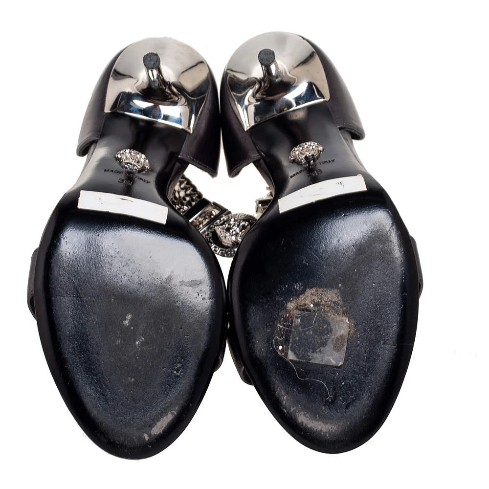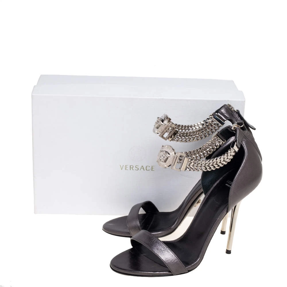Inspired by the historical and signatory motifs of the House, these sandals from Versace accurately justify the label’s skilled flair and vintage aesthetic. They are crafted from leather and augmented with silver-toned Medusa motifs and chain details on the upper. They are completed with 11.5 cm heels.