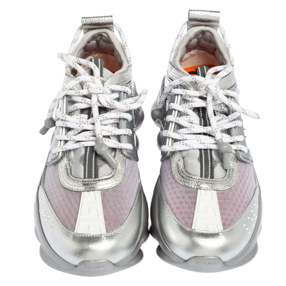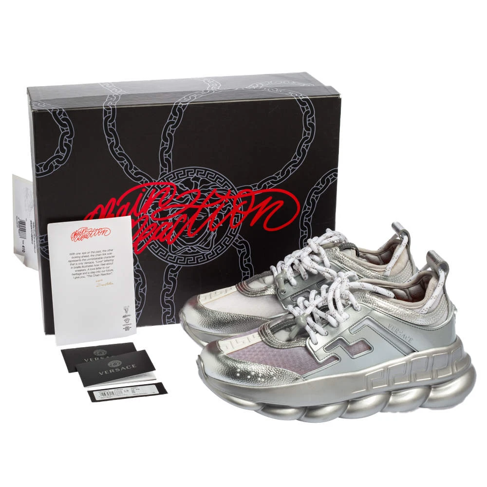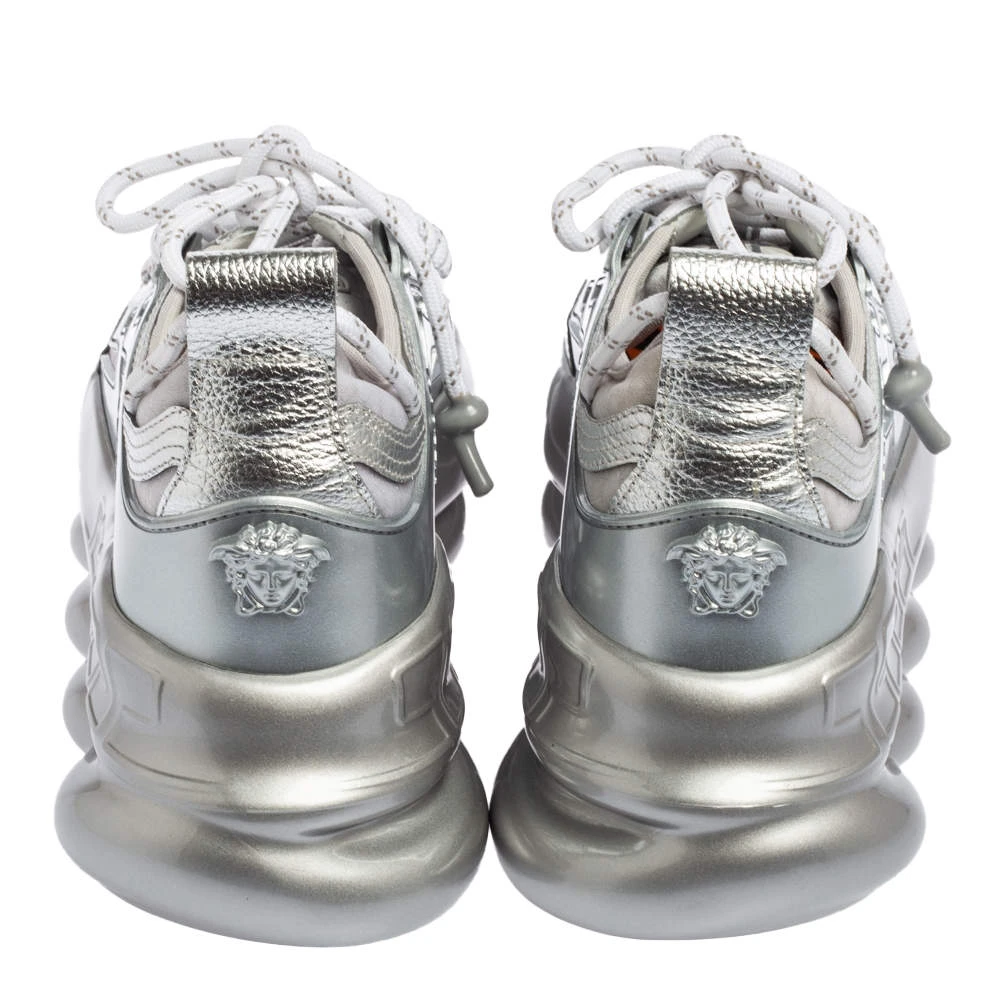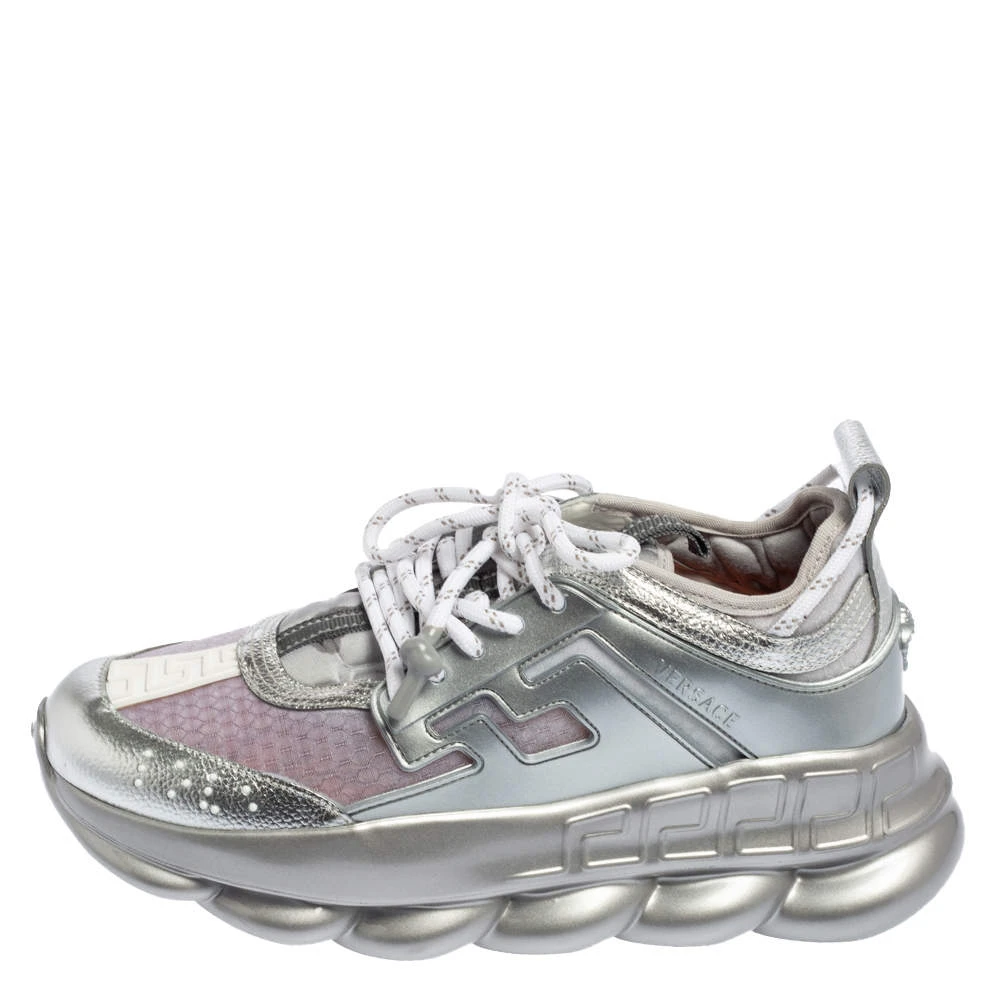 Versace’s Chain Reaction sneakers are for fashionable people like you and a stylish take on the chunky sneaker trend. These ones are crafted from high-grade materials in metallic grey. They feature laces, signature detailing, high platforms, and outsoles featuring a chain-like design.