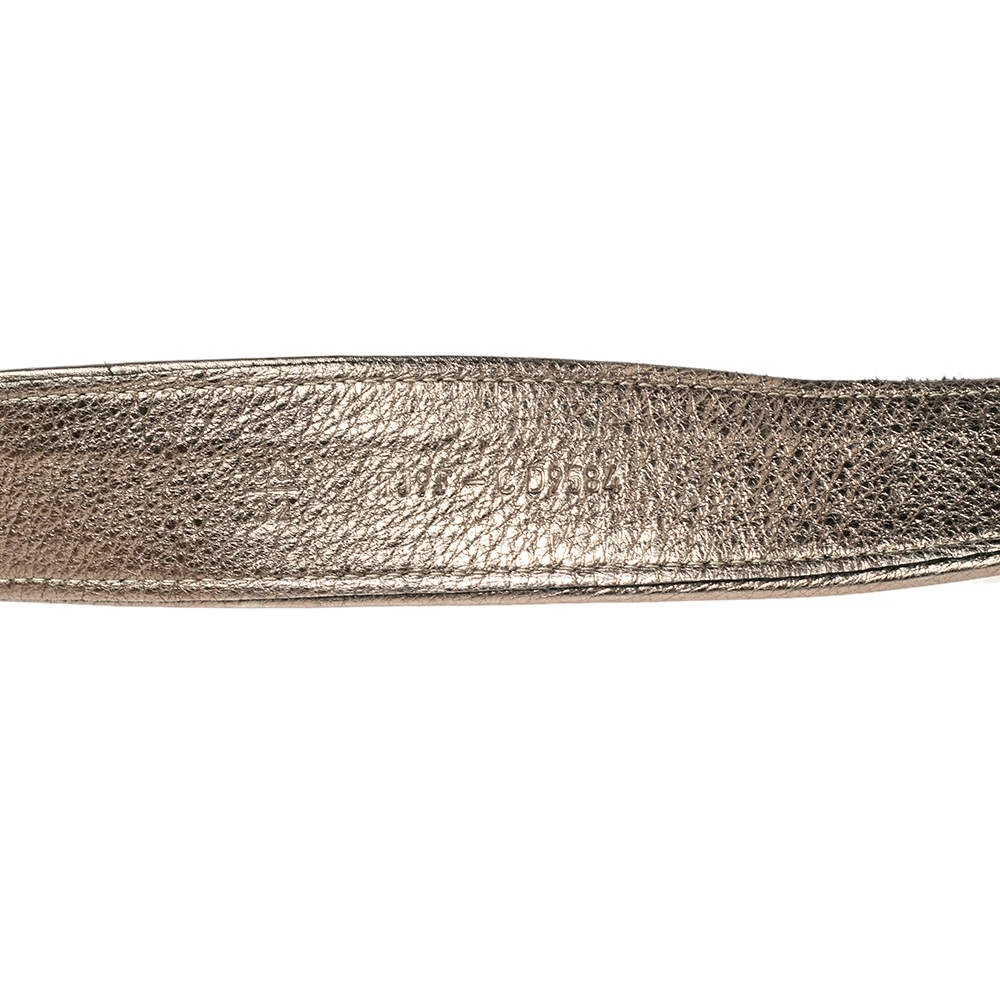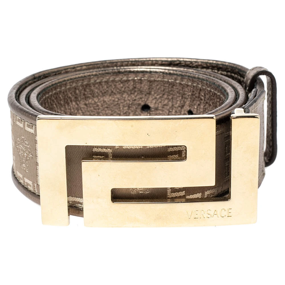 Accessorizing can effortlessly elevate an outfit and what better creation than a belt to make it happen! We have here, a Versace belt made from signature fabric and trimmed with leather. It has been adorned in a metallic grey shade and features a gold-tone Greca buckle on the front.