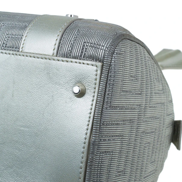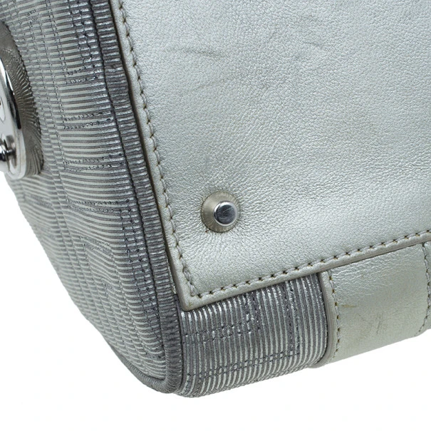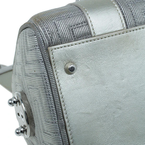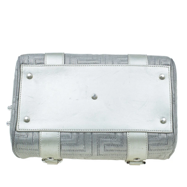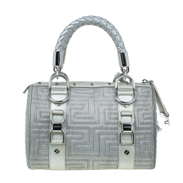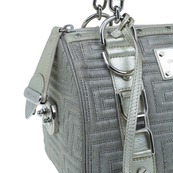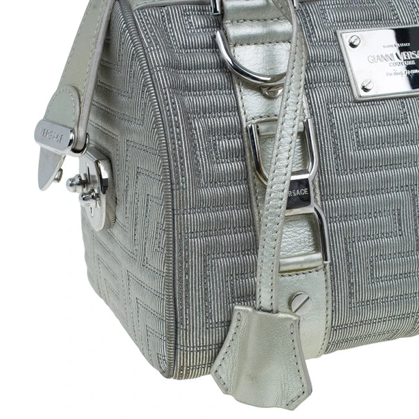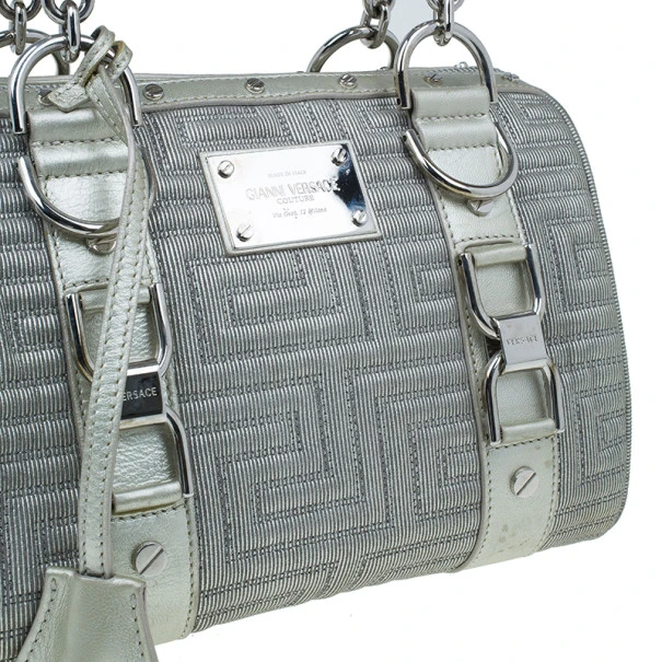This over the top Versace Snap Out of It bag was meant to make a bold statement from the fashion forward Italian label. Crafted from light silver quilted Versace logo leather, it is accented with braided handles, a Gianni Versace Couture plate, side pocket, silver studs and hardware. The interior is lined with fabric and features a zip pocket.