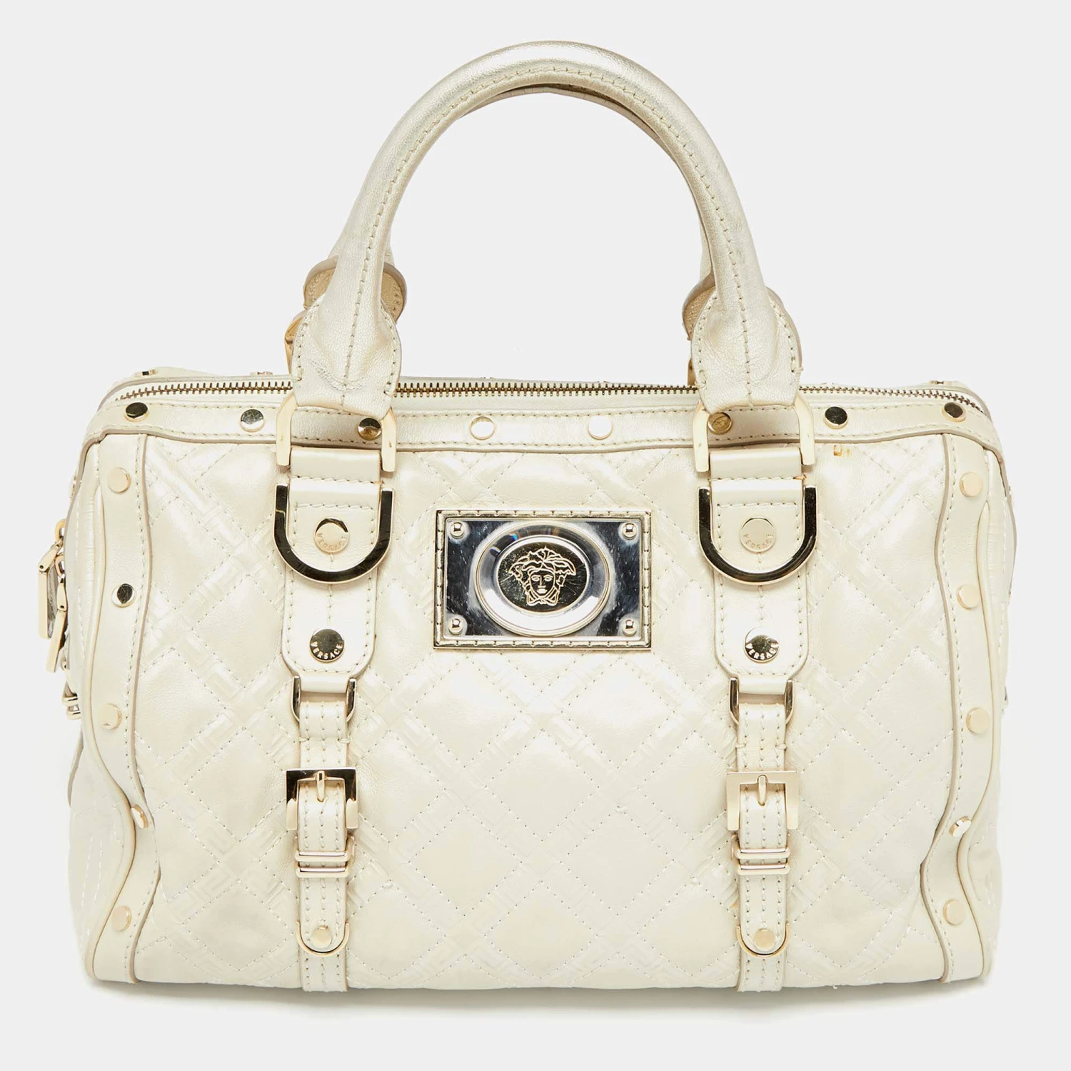 How gorgeous is this satchel from Versace! It carries an amazing design and a fabulous interplay of metallic pearl leather and gold-tone hardware. It has a zip-top leading to a satin interior while being held by two top handles. The shape and the brand logo on the front uplift its beauty and make it a buy you will not regret.
