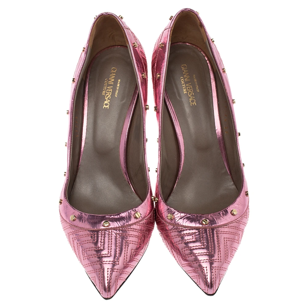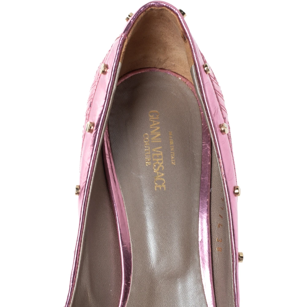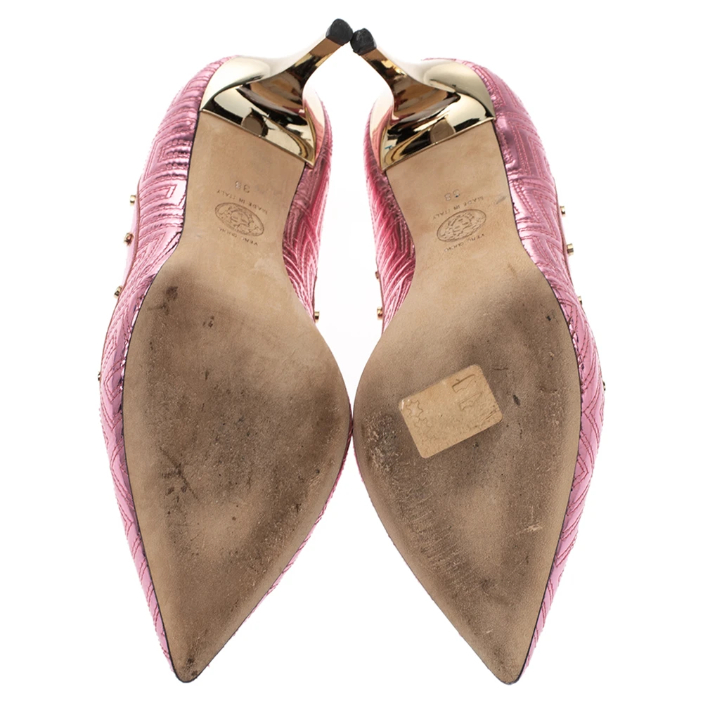 Give your collection of footwear a makeover by adding these pumps by Versace. Crafted from foil leather, they come in a lovely shade of metallic pink. They are styled with pointed toes, Greek key stitch detailing, studs along the topline and 9 cm heels.