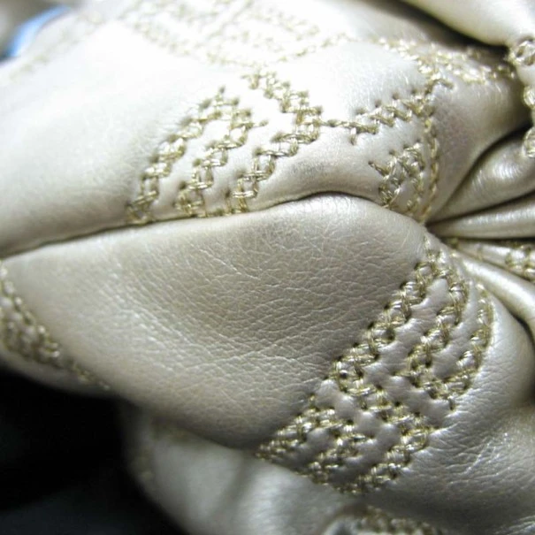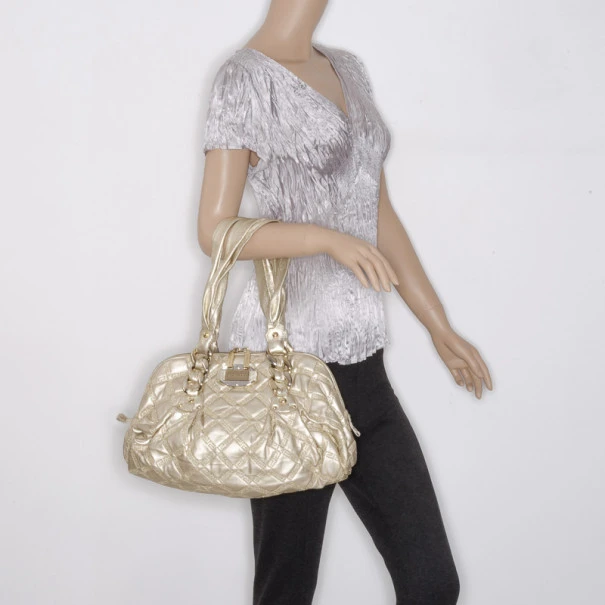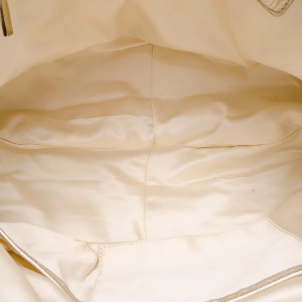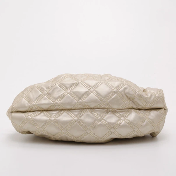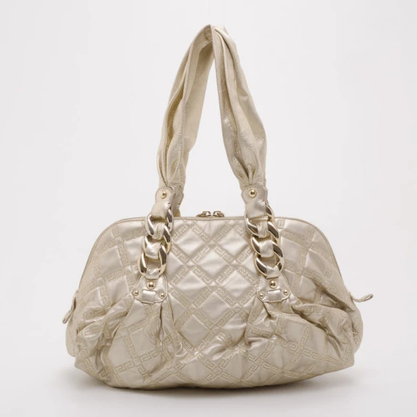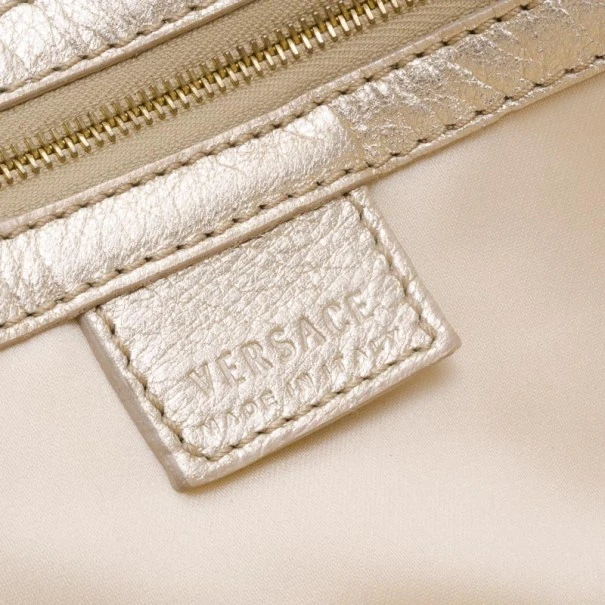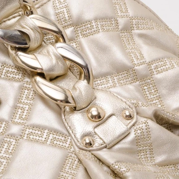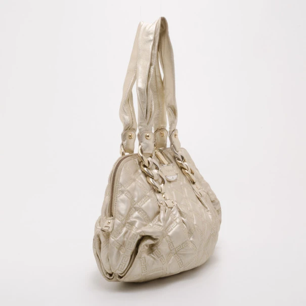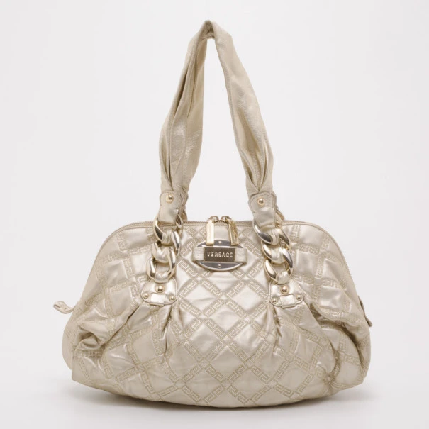 Go for a glamorous finish with this metallic quilted logo leather satchel from Italian label Versace. Crafted from metallic cream leather that is quilted with Versace logo stitching, the alluring look is finished with a Versace logo plate, chain link and leather handles, and easy to open double closures. The large interior is lined with cream fabric and features a zip pocket. Original Retail Price: US $1,695Condition: Gently Used (One very minor scuff mark on bottom corner of bag. Otherwise, very clean exterior and interior. Hardware in good condition)Dimensions: 42 CM(L) 24.5 CM(H) Handle Drop: 21 CM (Distance between handle and top of the bag)Material: Leather Exterior, Fabric InteriorHardware: Gold and Silver-toneIncludes: Original Dustbag