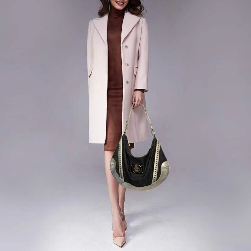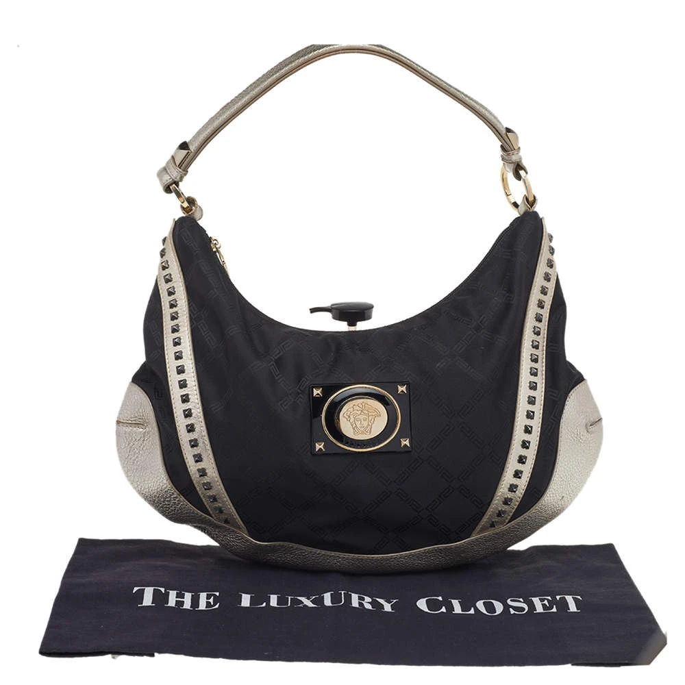 Keep it classy with a twist of edge with this Versace hobo. Its black & metallic silver signature canvas & leather exterior is designed with stud embellishments for a bold look. The top zip closure opens to a fabric-lined interior that houses enough space for essentials.