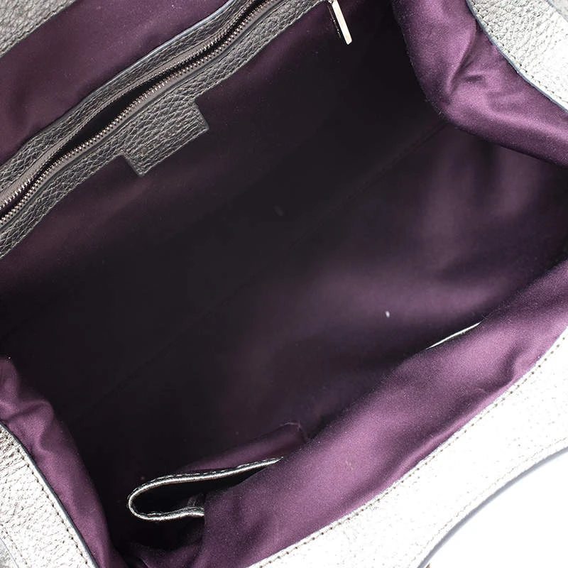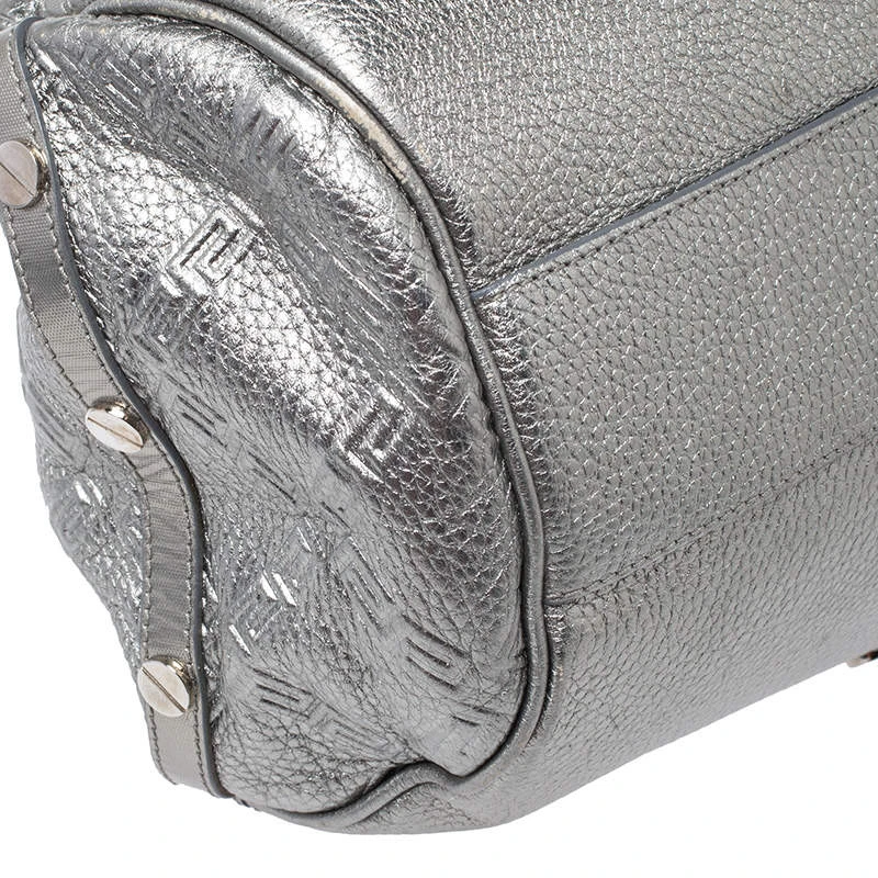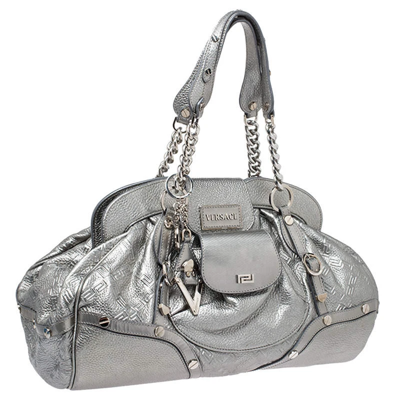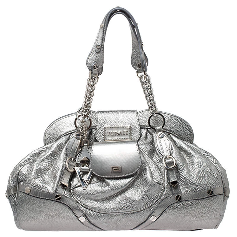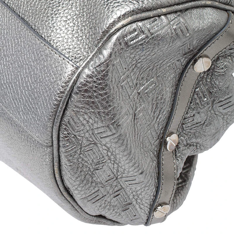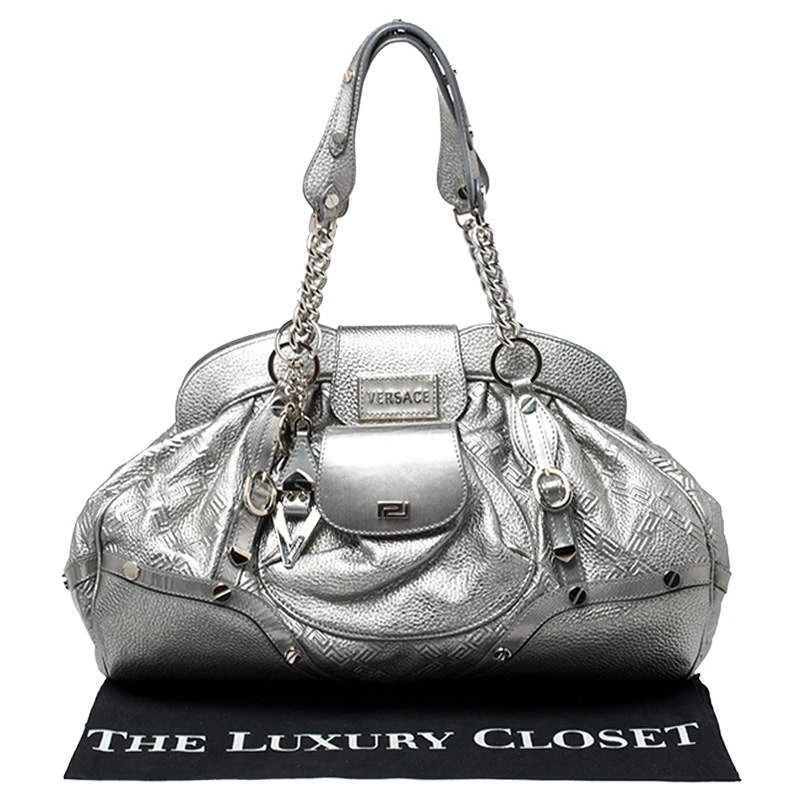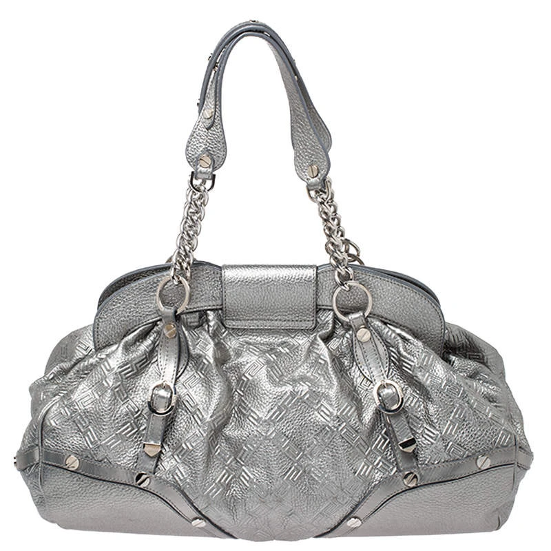 Designed in a unique and wonderful silhouette, this satchel from Versace will be a special addition for any closet. It is crafted from metallic silver leather and is accented with studs on the exterior along with a flap pocket at the front. The bag opens to a satin-lined interior housing a zip pocket. Two well-fashioned top handles and silver-tone hardware make the bag complete. Make this chic creation yours today.