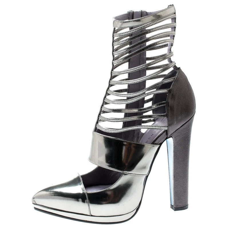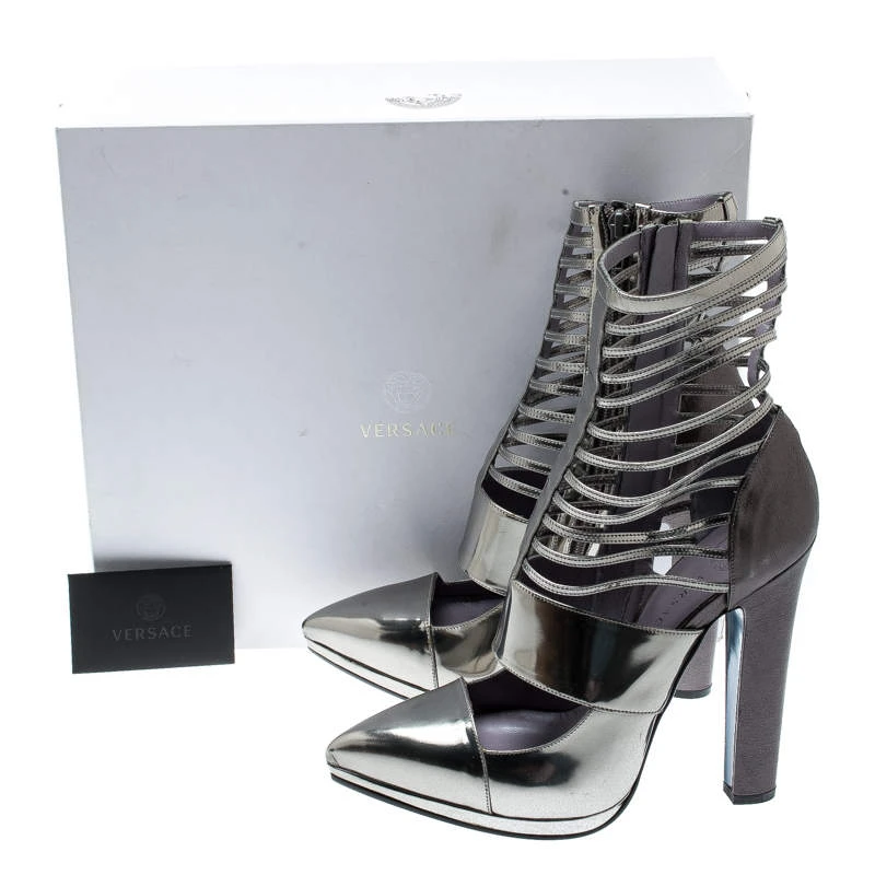 With a bold silhouette, these Versace sandals are fierce! Cage-like structure and pointed toes make these metallic silver pair an instant attention-grabber. High block heels and sturdy soles complete the luxurious look. Keep your accessories simple and let your leather shoes speak for themselves!