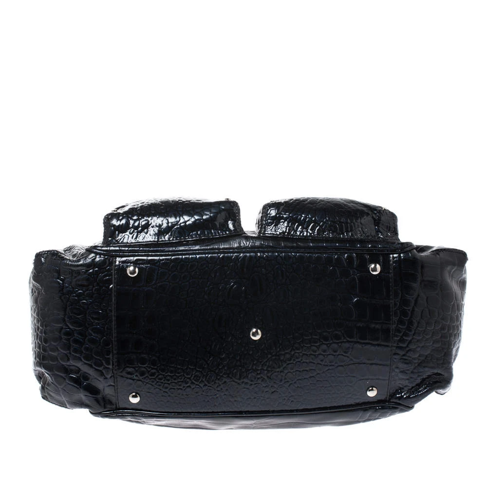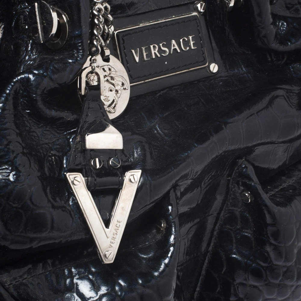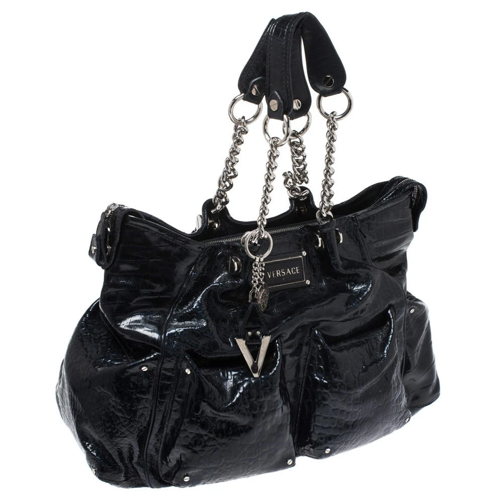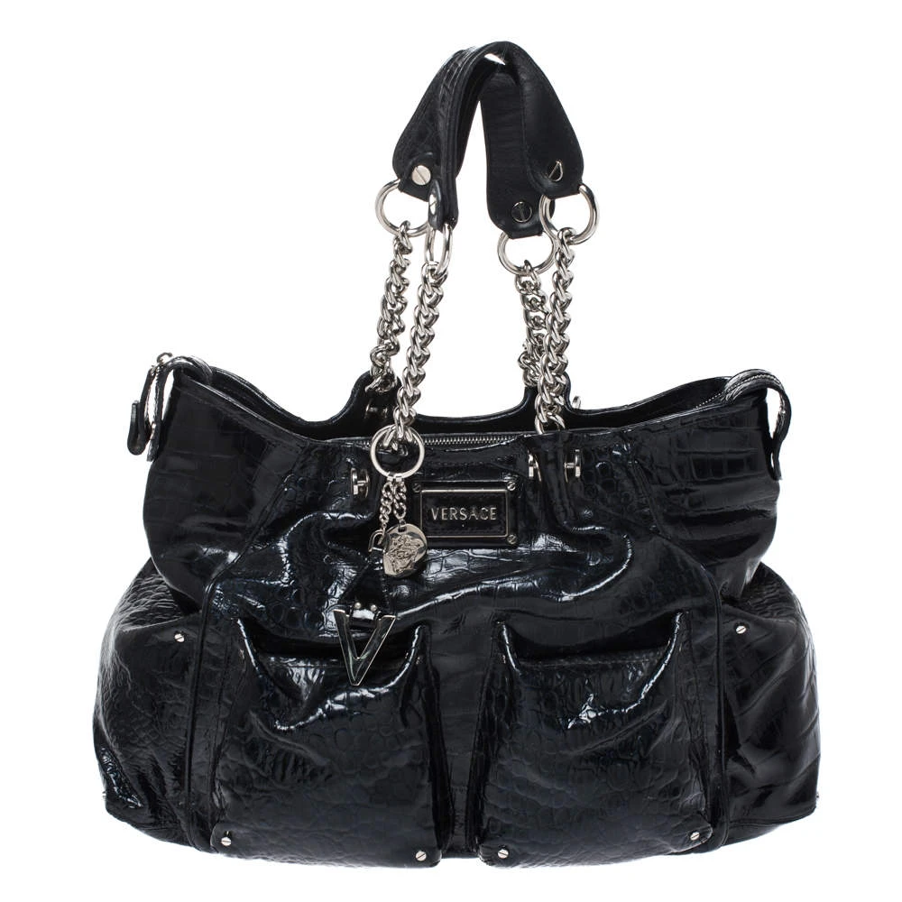 Designed to last, this beautiful tote from Versace is a prized buy. Comfortable and easy to carry, this croc-embossed patent leather creation comes in blue with a logo charm on the front. It has twin chain handles and an interior lined with satin to keep your essentials organized and safe.