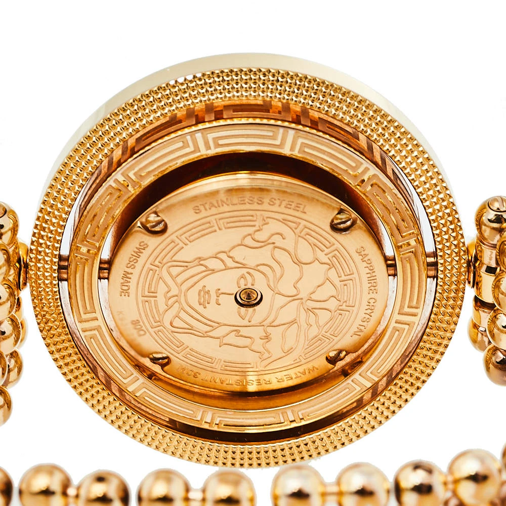 Flaunt your elegant style with this luxe wristwatch from Versace. This Eon wristwatch, created from gold-plated stainless steel, is characterized by its unique rotating case design. Following a quartz movement, the watch features a beautiful mother of pearl dial with two hands and stud hour markers. It is water-resistant up to 30 meters and is equipped with a link bracelet. (NOTE: The item may be restricted for shipping outside the UAE. Please contact us on [email protected] to check if the item can be shipped to your country.)