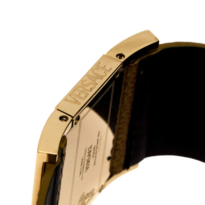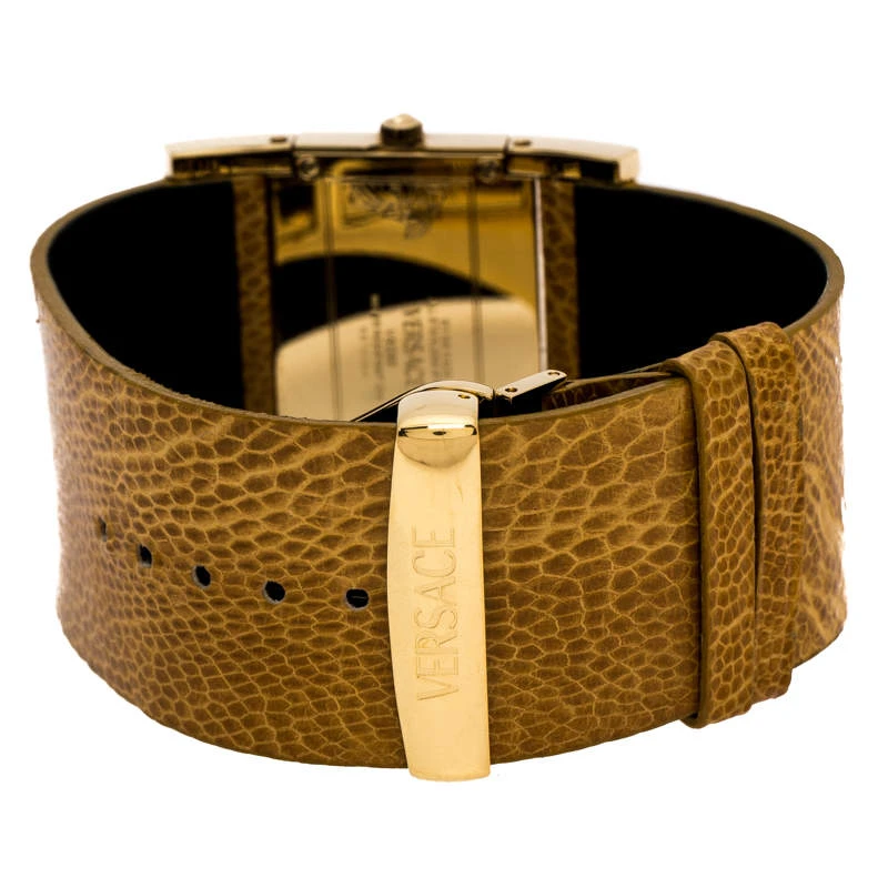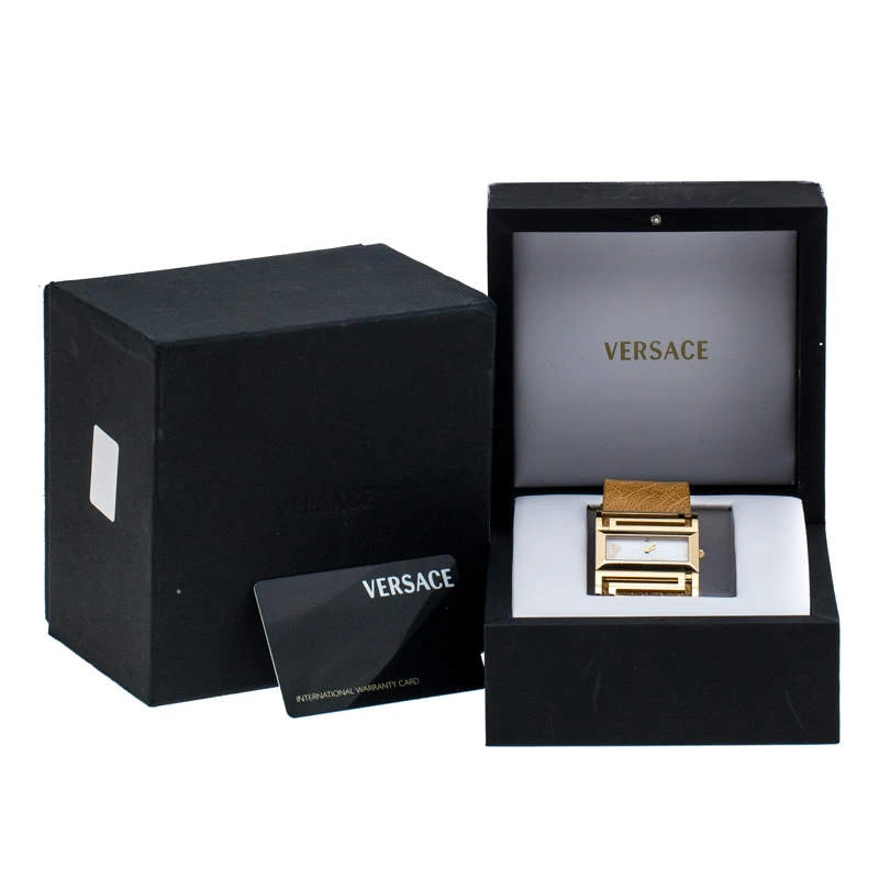 Stand out with this Versace wristwatch. Made from gold-plated stainless steel, the rectangular case holds a bevelled bezel with the meander pattern on the lugs. Its Mother of Pearl dial is contrasted with hour indexes, Roman numerals and hands. The dial also holds the Medusa insignia. Featuring a 30m water resistance level, this quartz watch has a wide leather band with engraved buckle closure. NOTE: The item may be restricted for shipping outside the UAE. Please contact us on [email protected] to check if the item can be shipped to your country.