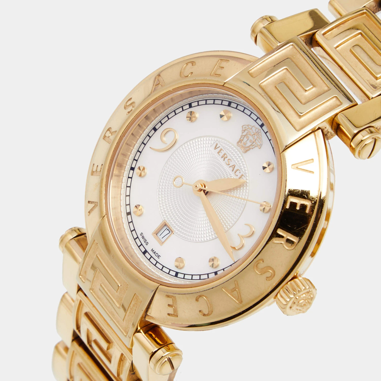 This Versace quartz watch is an ideal choice for everyday use. Made from gold-plated stainless steel, it features a branded bezel, a round case set with a Mother of Pearl dial, and a comfortable link bracelet. NOTE: The item may be restricted for shipping outside the UAE. Please contact us on [email protected] to check if the item can be shipped to your country.