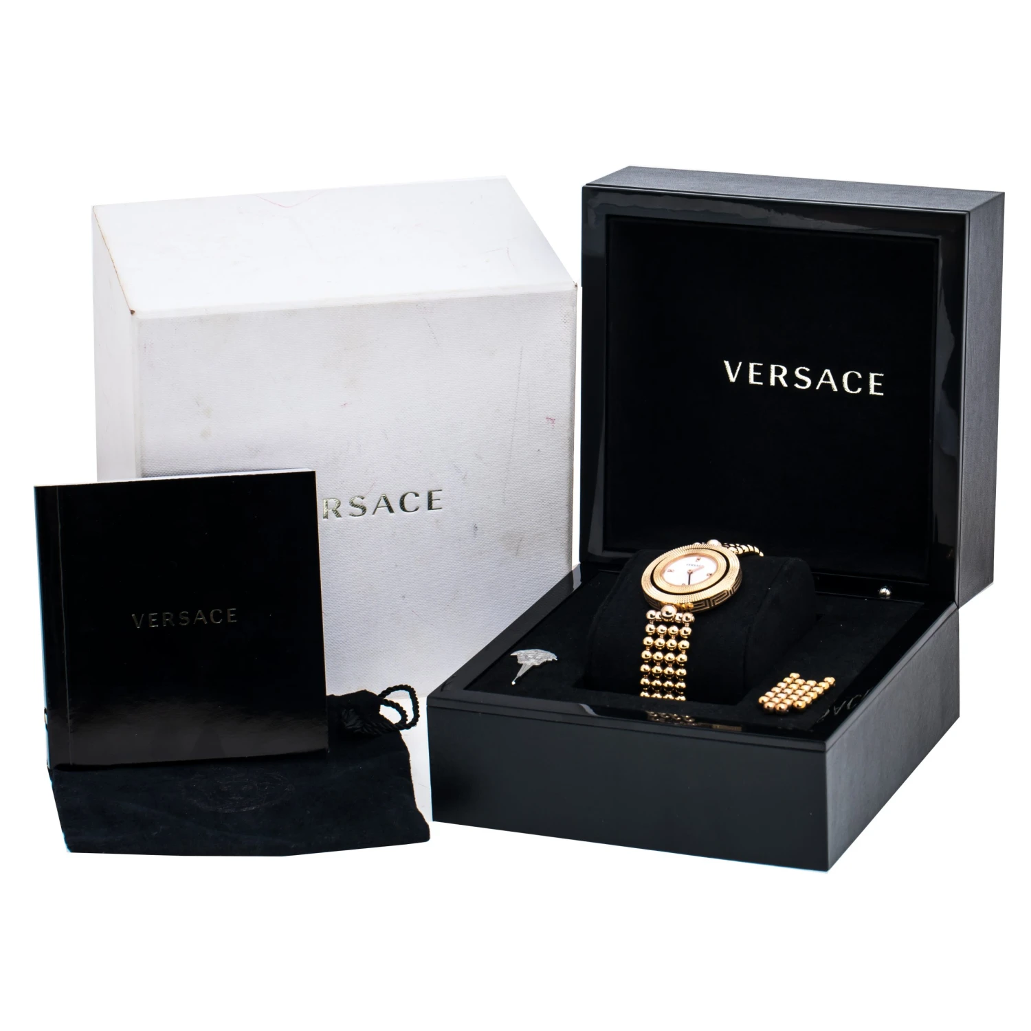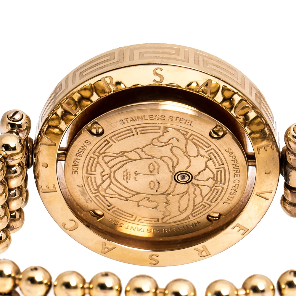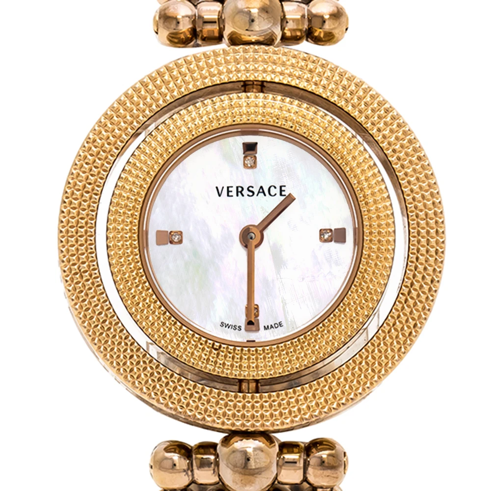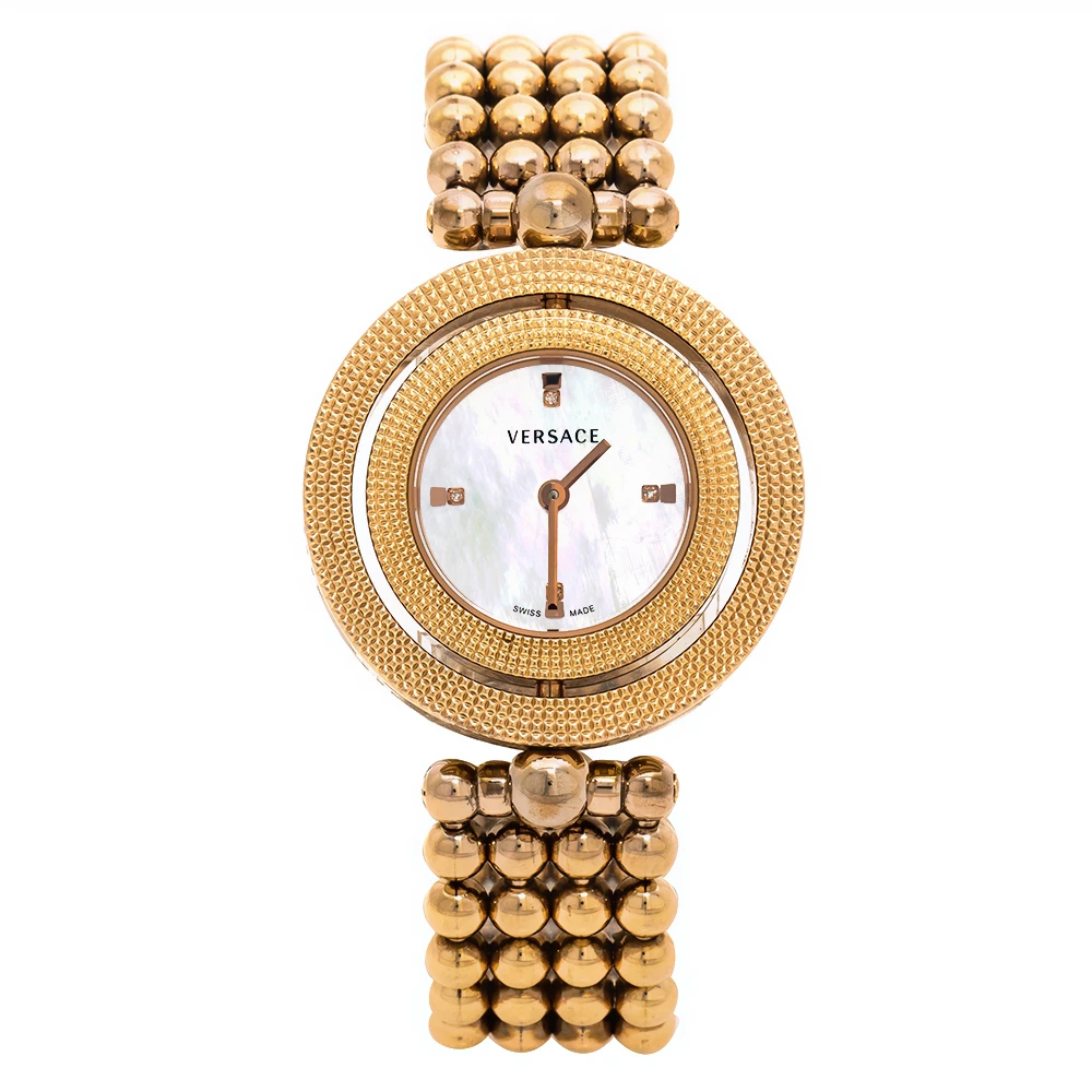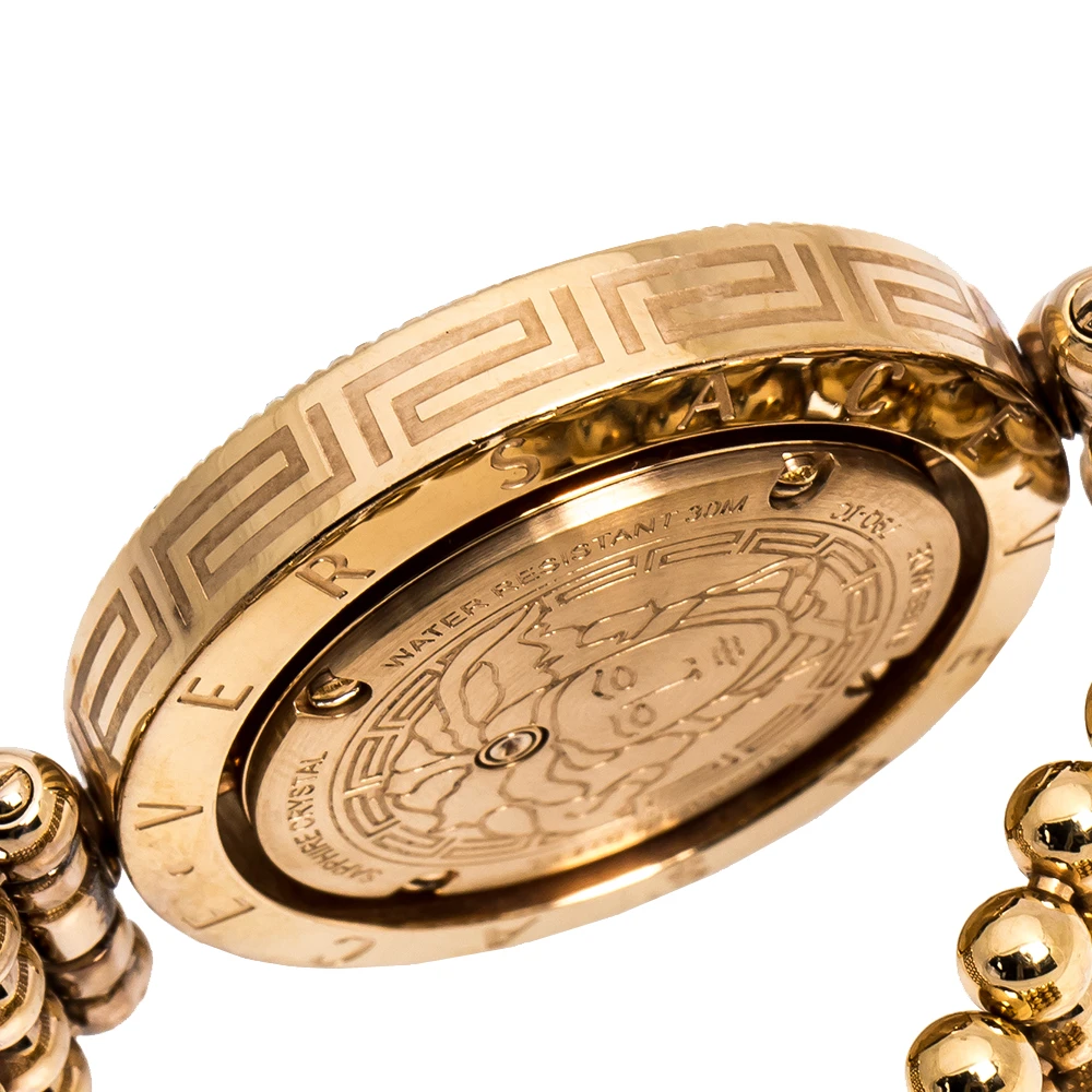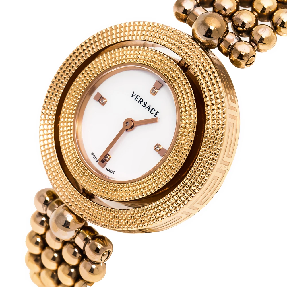 Flaunt your elegant style with this luxe wristwatch from Versace. This Eon wristwatch, created from rose gold PVD-coated stainless steel, is characterised by its unique rotating case design. Following a quartz movement, the watch features a beautiful mother of pearl dial with two hands, and quarterly hour indexes. It is complete with a matching, beaded bracelet.