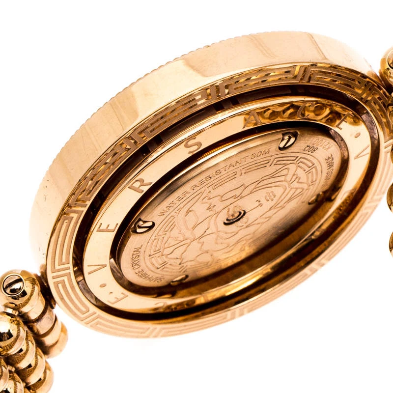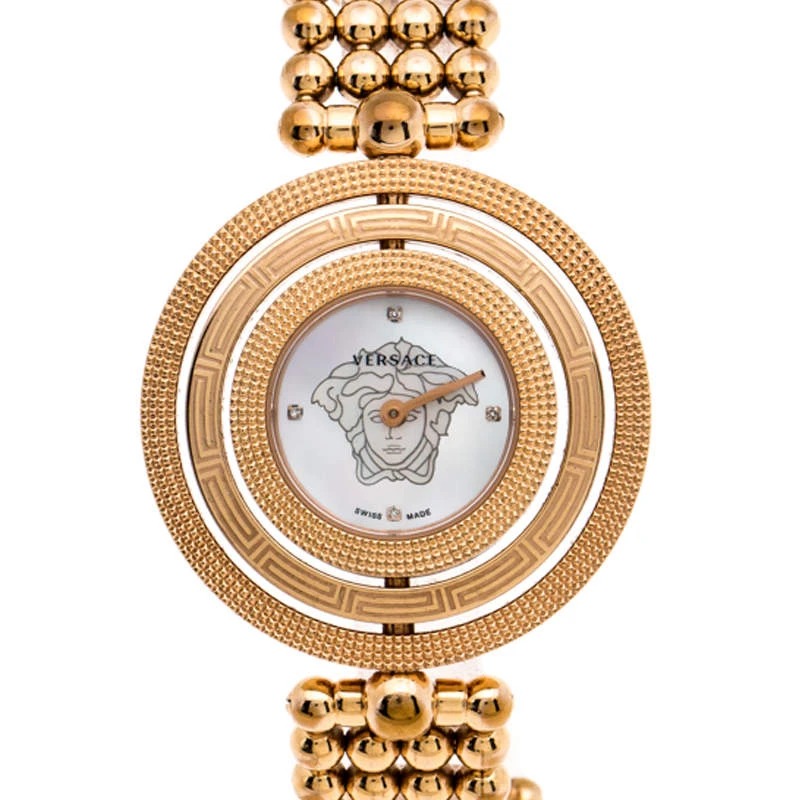 Flaunt your elegant style owning this luxe wristwatch from Versace. This Eon wristwatch, created from rose gold-plated stainless steel, is characterised by its unique spinning case design. Following a quartz movement, the watch features a beautiful, white Mother of Pearl dial with the iconic Medusa head, gold-tone hands, and stone hour markers. It is water-resistant up to 30 meters and is equipped with a beaded chain-link bracelet that fastens with a simple clasp.