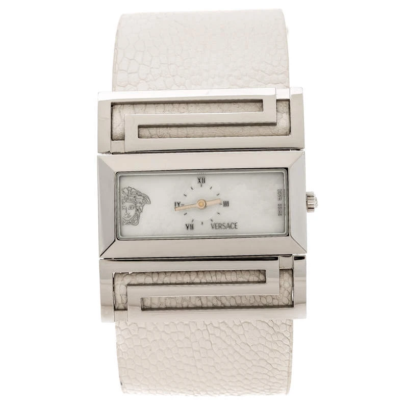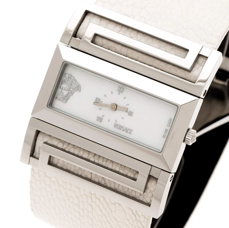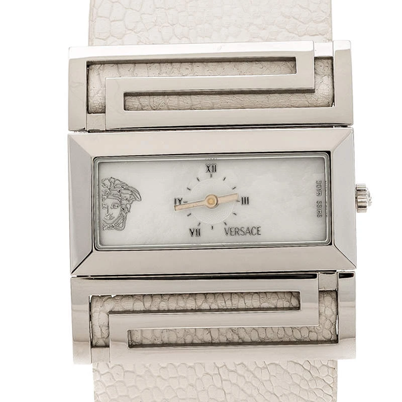 Stand out with this Versace wristwatch. Made from stainless steel, the rectangular case holds a bevelled bezel with the meander pattern on the top and bottom sides. Its mother of pearl dial is contrasted with hour indexes, Roman numerals and hands. The dial also holds the Medusa insignia. Featuring a 30m water resistance level, this quartz watch has a wide and embossed leather band with engraved buckle closure. (Note: The item may be restricted for shipping outside the UAE. Please contact us on [email protected] to check if the item can be shipped to your country.)
