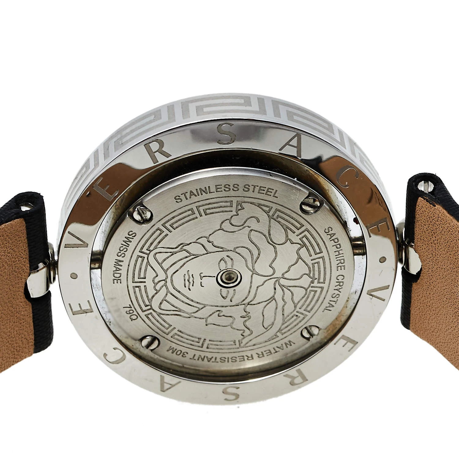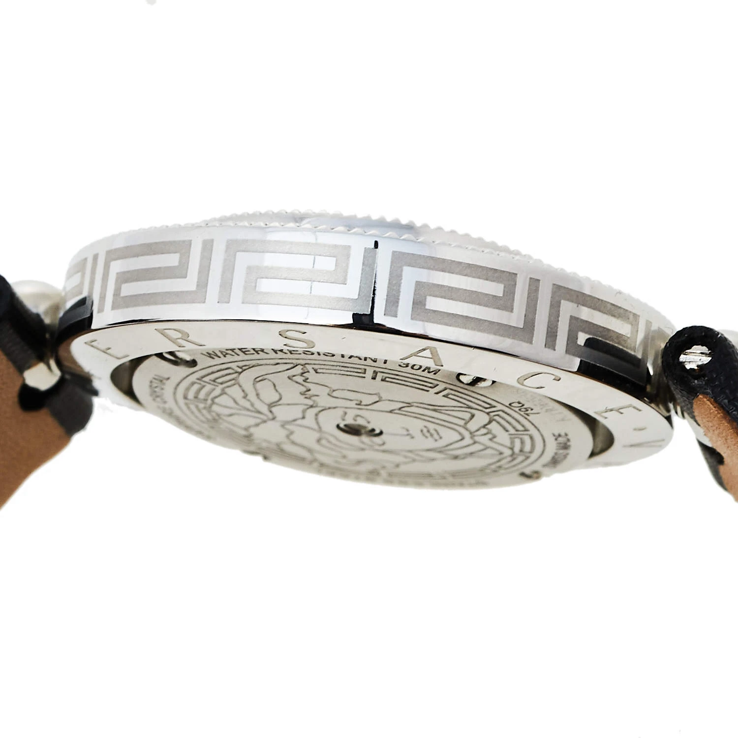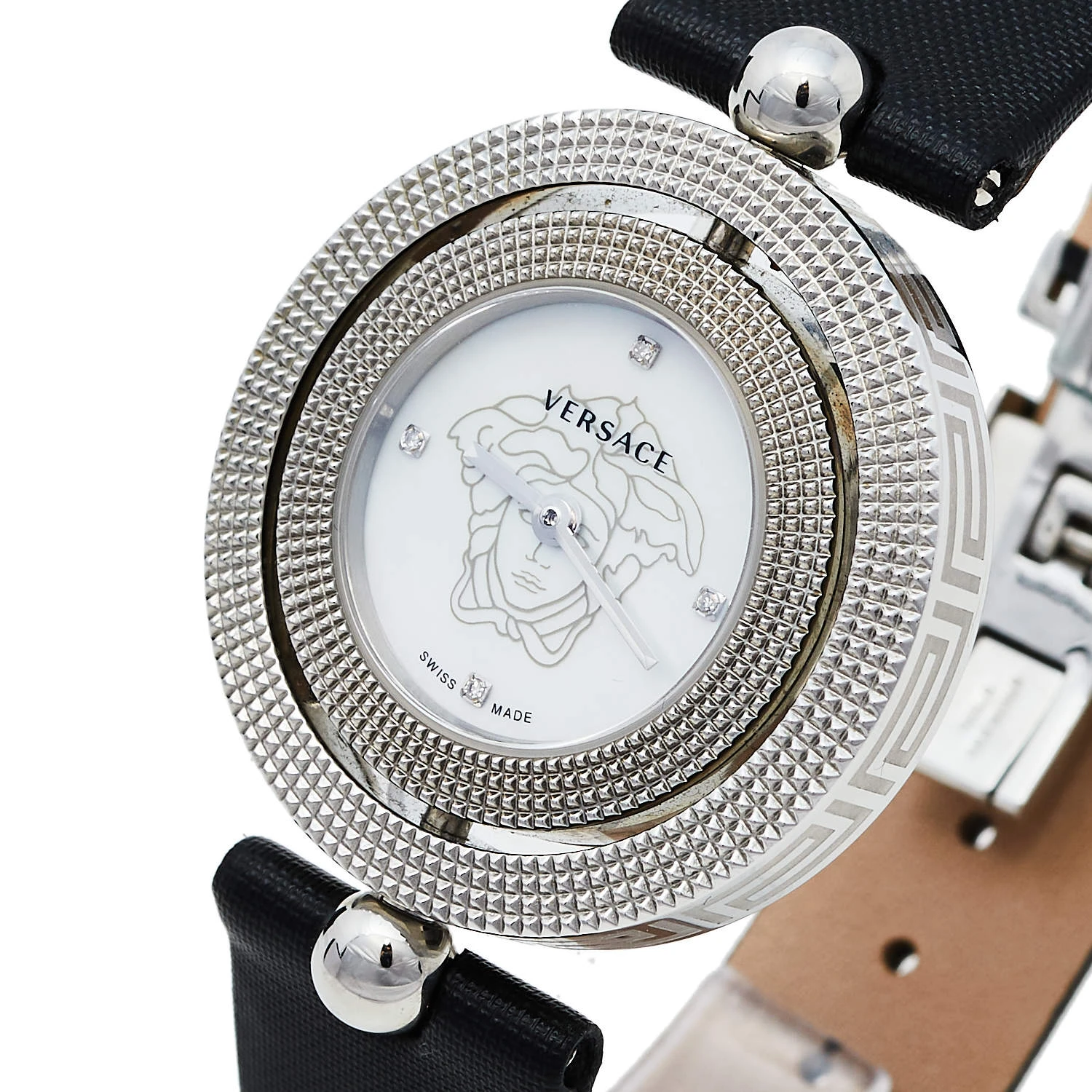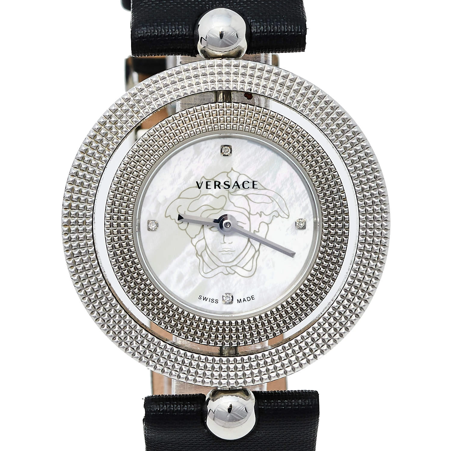 Flaunt your elegant style with this luxe wristwatch from Versace. This Eon wristwatch, created from stainless steel, is characterized by its unique rotating case design. Following a quartz movement, the watch features a beautiful mother of pearl dial with the iconic Medusa head, two hands, and studded hour markers. It is water-resistant up to 30 meters and is equipped with a leather and stainless steel bracelet that fastens with a fold-over clasp. (Note: The item may be restricted for shipping outside the UAE. Please contact us on [email protected] to check if the item can be shipped to your country.)