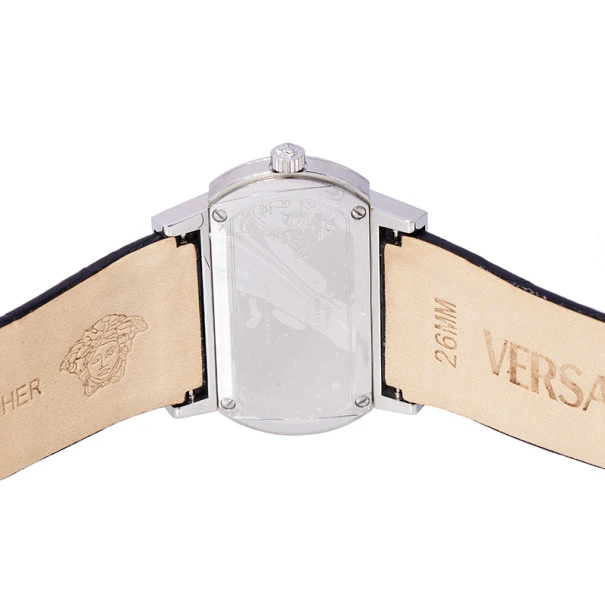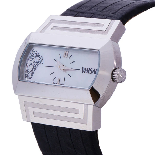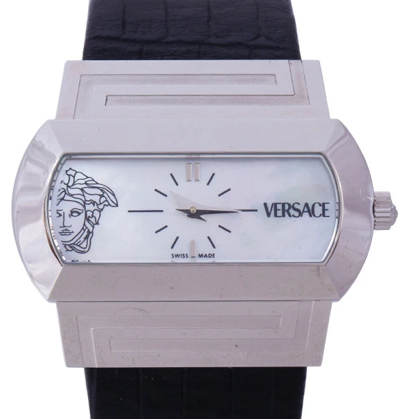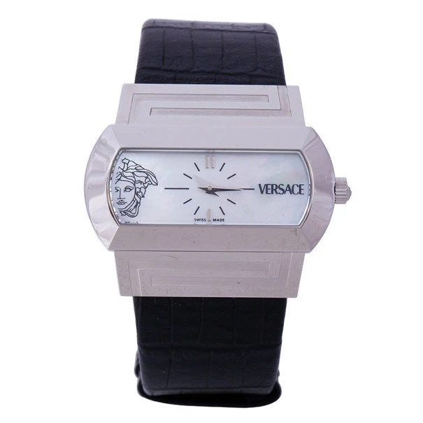 Stand out with this slick Versace wristwatch. Made from stainless steel, the horizontal oval case holds a beveled bezel engraved with the meander pattern on the top and bottom sides. Its Mother of Pearl dial is contrasted with black hour indexes and silver-tone indicators at the 6 and 12 o’clock matching with the pointed hands. Its right and left sides hold ther Versace logo and an outlined design of the Medusa insignia. Featuring a 30m water resistance level, this quartz watch has a wide and embossed leather band with an engraved buckle closure.Original Retail Price: US $884