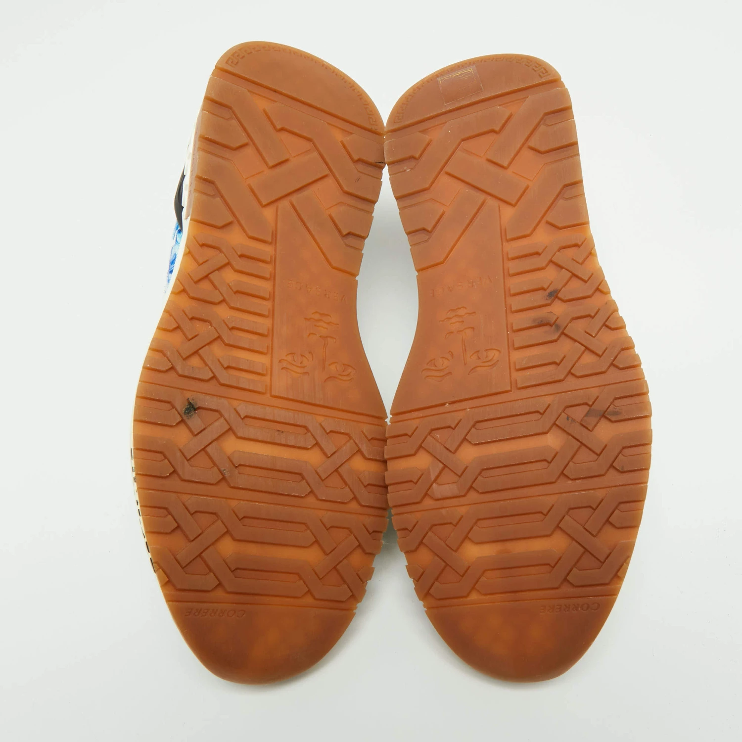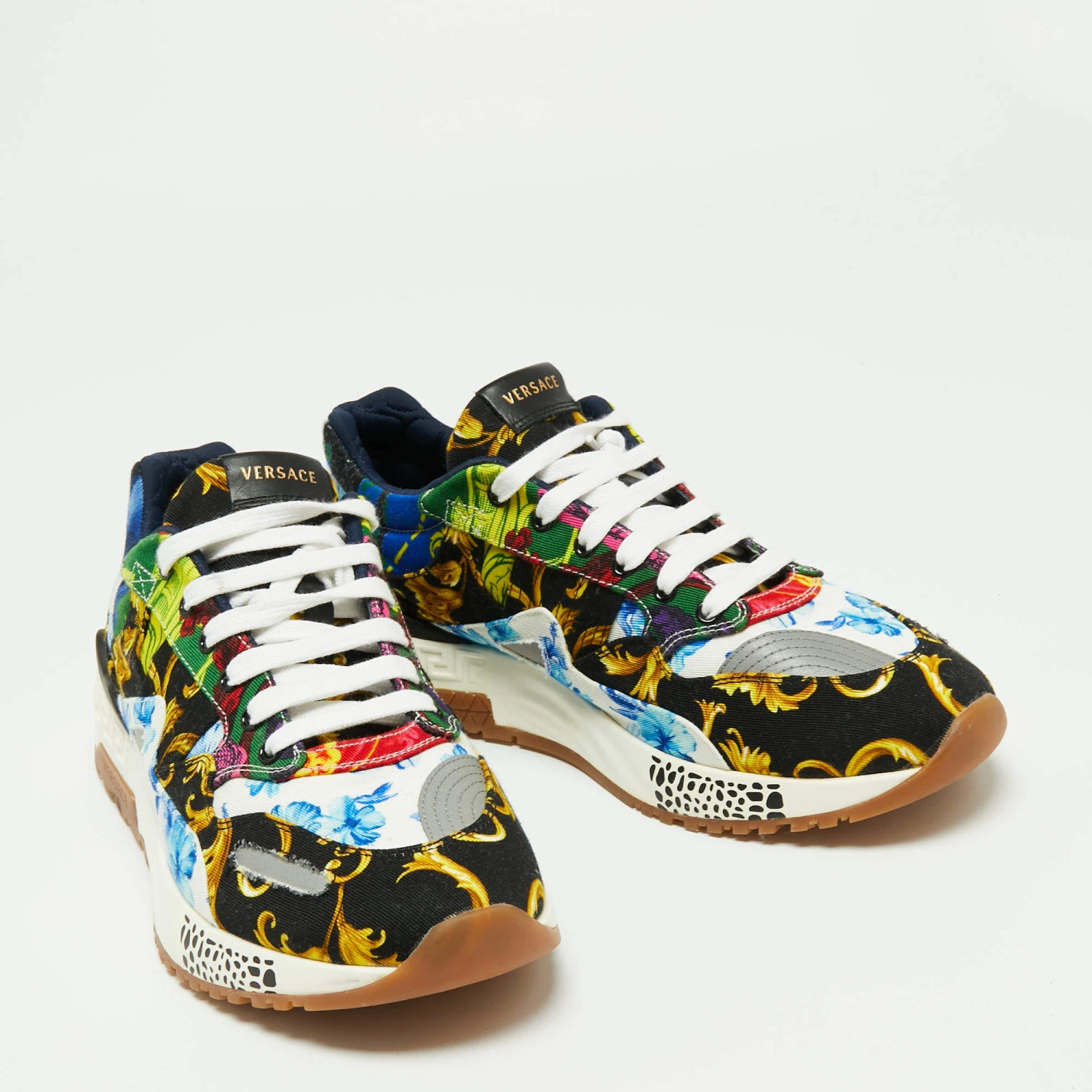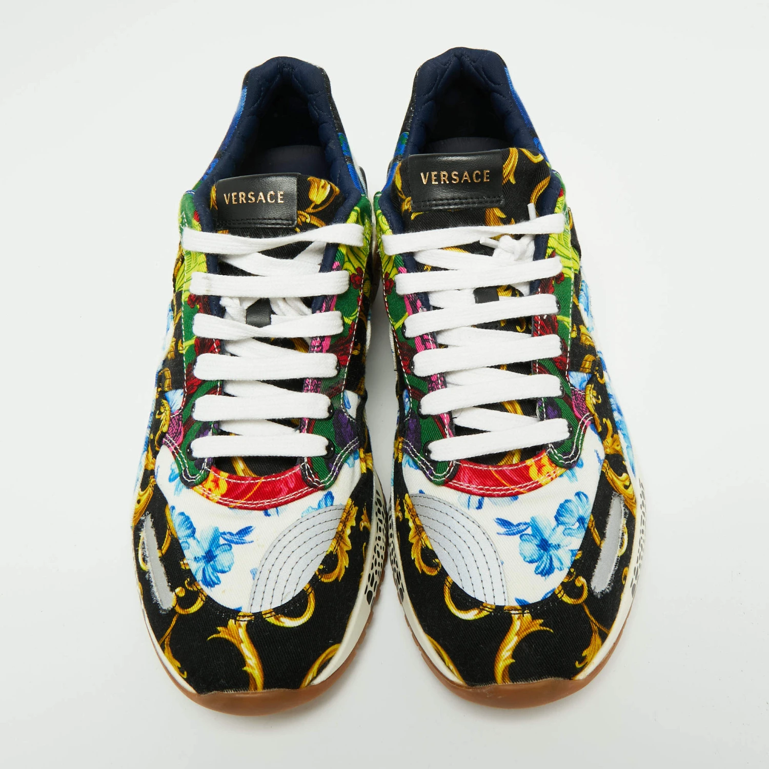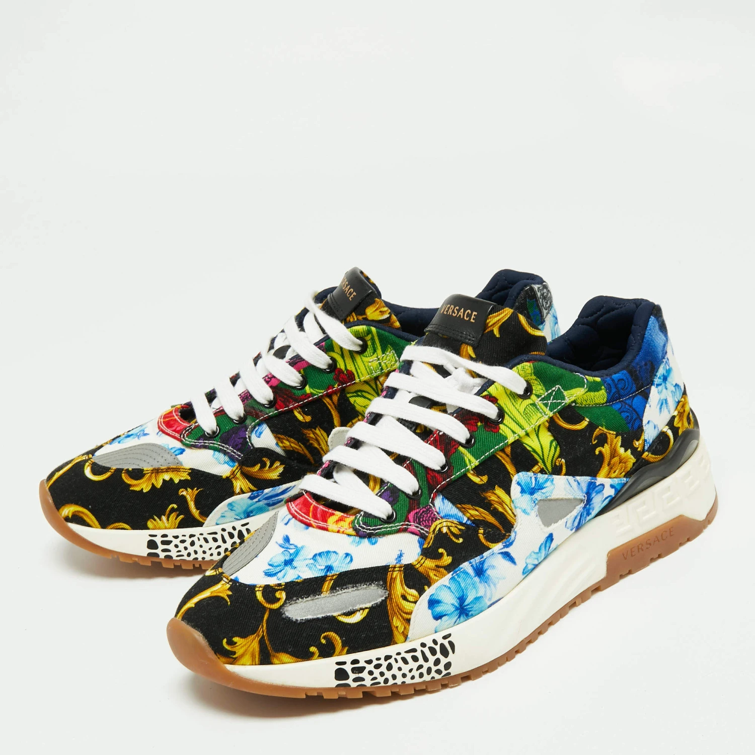 Sneakers are the best way to experience total comfort and luxury, and these Barocco Chain Reaction sneakers from the House of Versace will give you just that! They are crafted from multicolored canvas on the exterior. They showcase lace-ups on their vamps. Add them to your collection now!