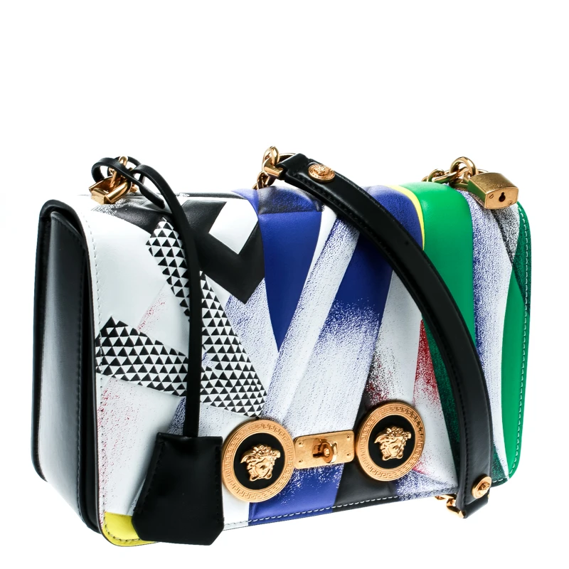 Make a striking appearance with this fashionable shoulder bag by Versace. This elegant creation is at once a fashion statement as well as a rational necessity. It is crafted from leather is adorned with multicolored prints all over along with two gold-tone signature Medusa motifs, one on each side of the turn lock closure. Lined with leather, it has a spacious interior where you can stow all your basics. This pretty piece is complete with a padlock, a key in leather clochette and a shoulder strap.