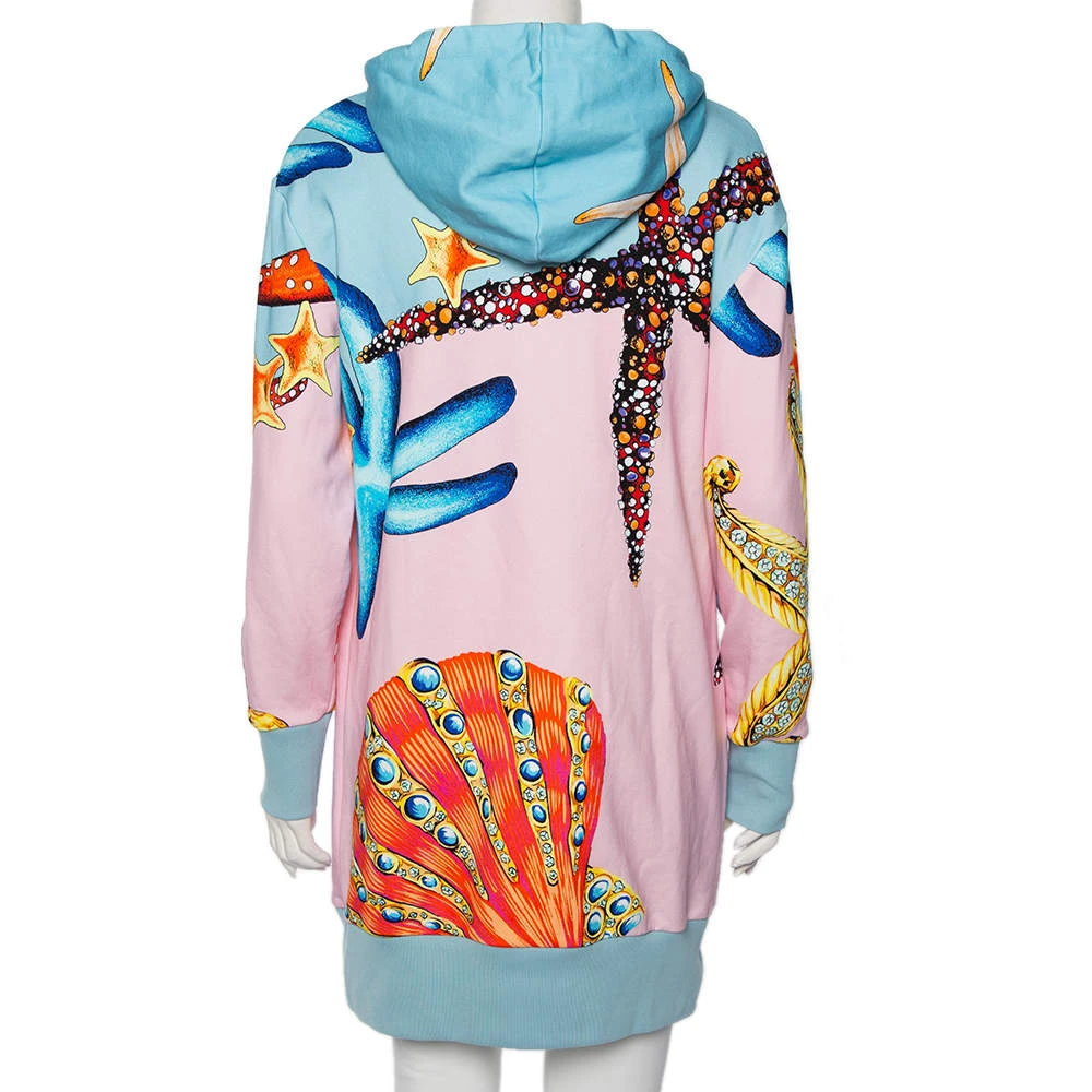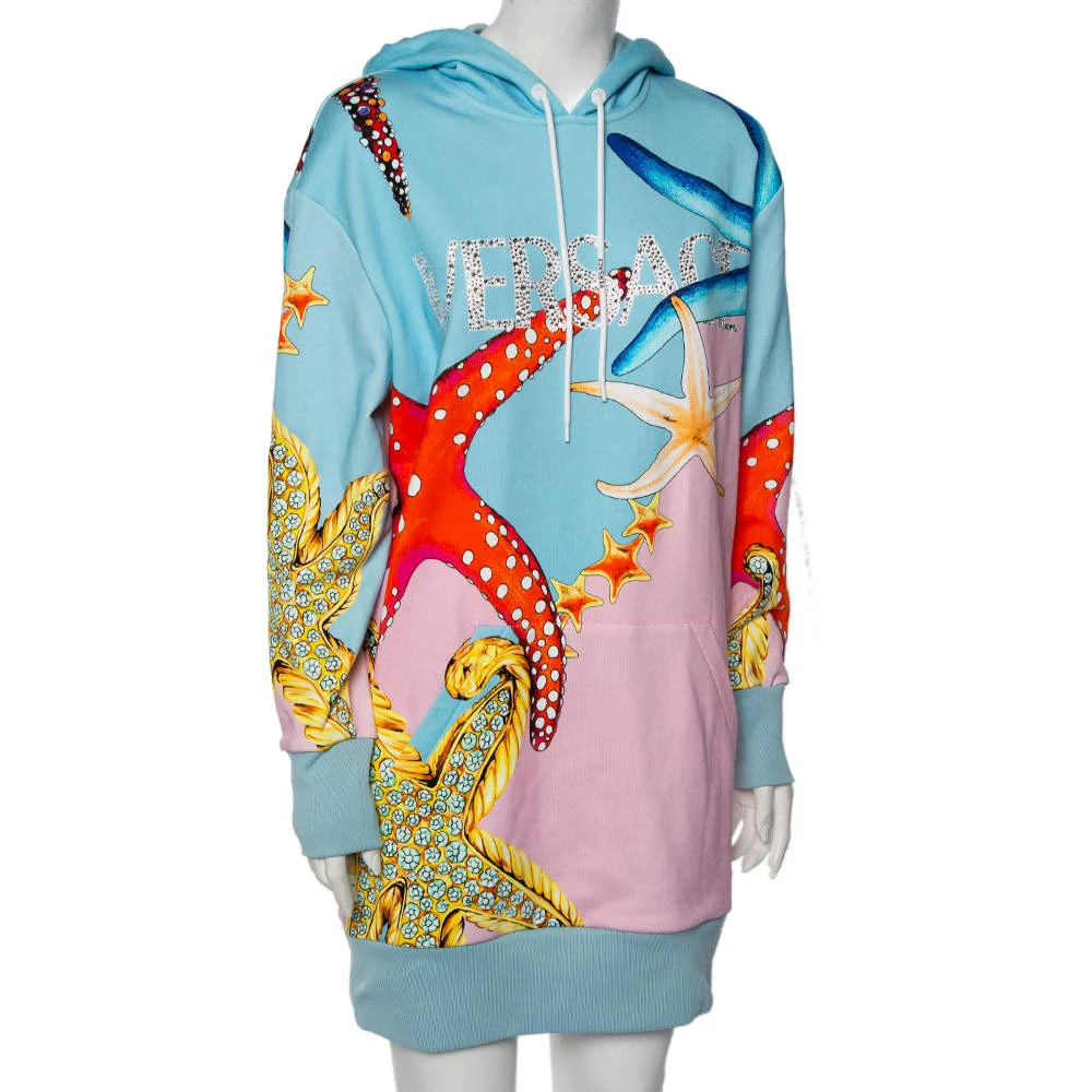 Grab this stylish sweater dress from the house of Versace. Crafted from quality materials, this creation flaunts multicolored hues. It is made unique with a lovely print and is styled with long sleeves, a hood, and a comfortable fit.