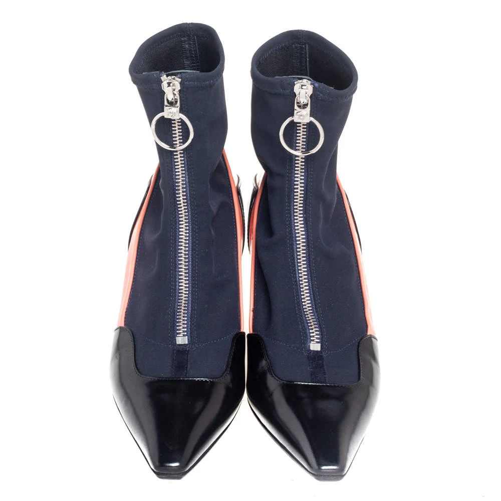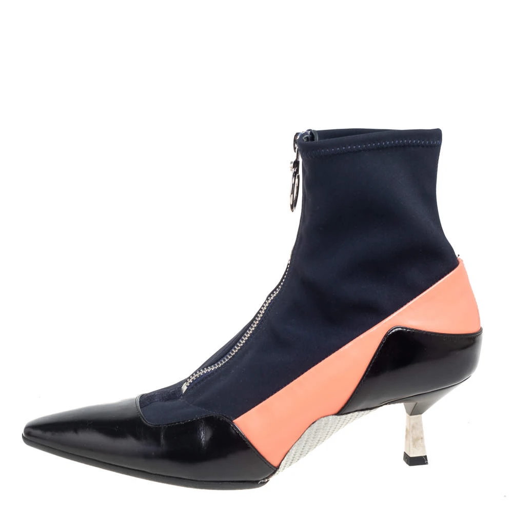 Versace designs are created with such versatility and chic aesthetics that they are bound to remain memorable to you. These boots from Versace are designed using multicolored fabric and leather into an ankle-length silhouette. They show pointed toes, a silver-toned zipper, and 6 cm heels.