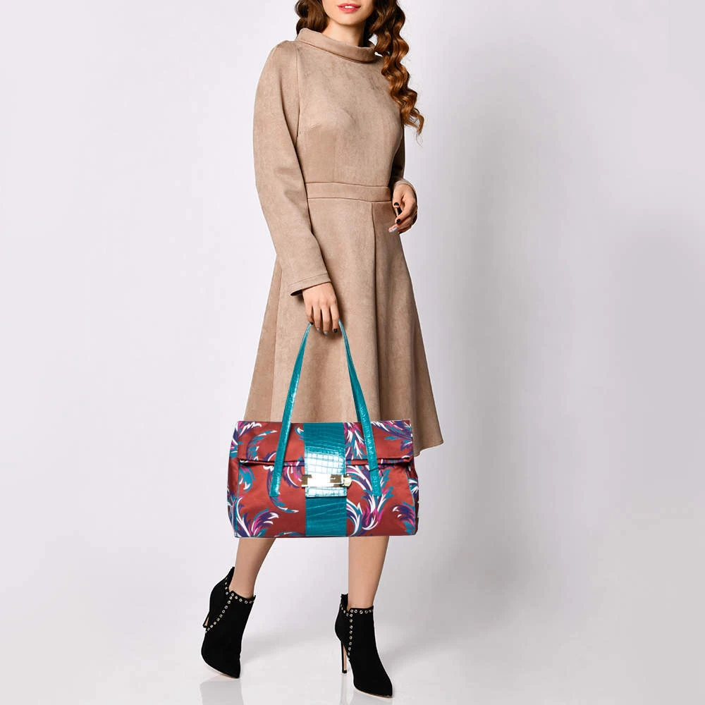 Made from floral-print fabric and croc-embossed leather, this Versace tote brings a spacious size and a refined appeal. It features two handles, gold-tone hardware, and a fabric-lined interior.