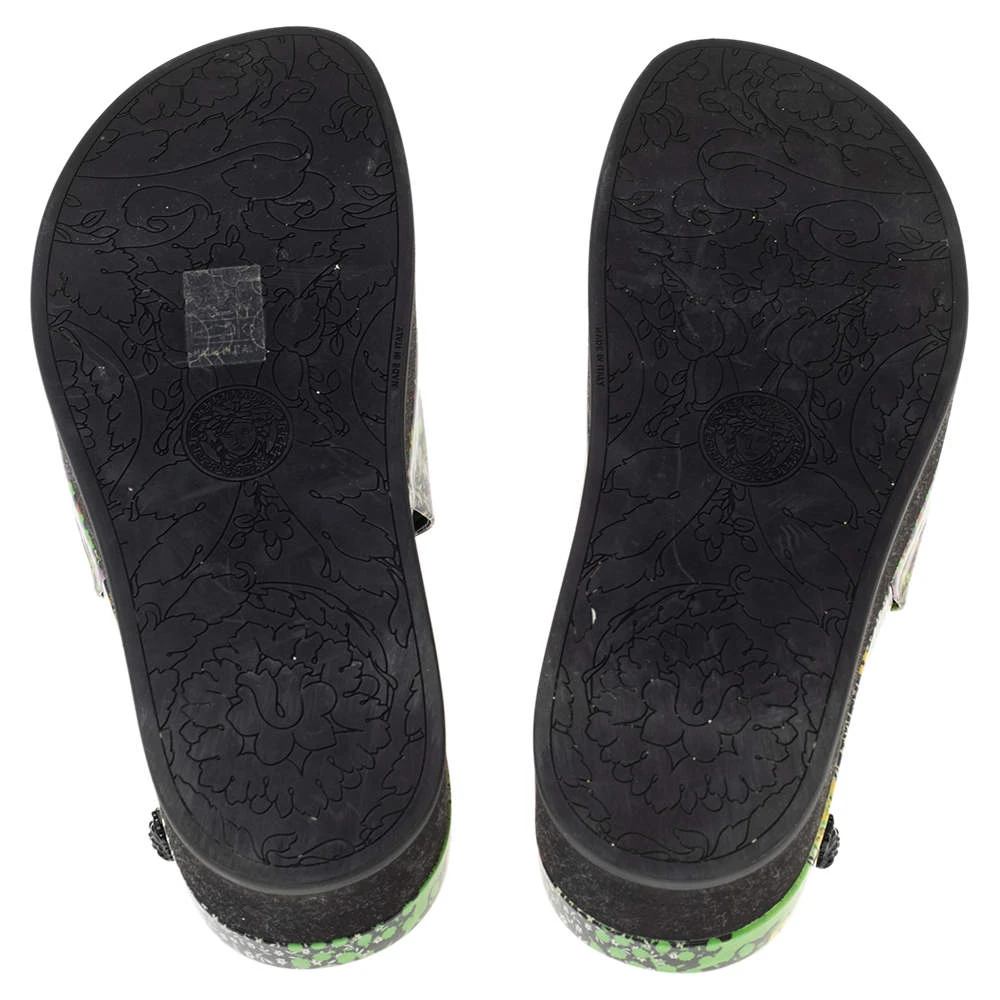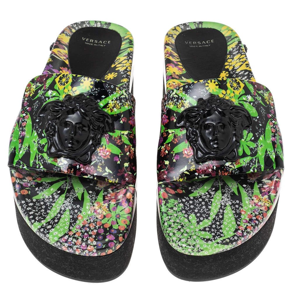 These Versace slides have a printed patent leather upper stacked upon a solid black platform base. The Medusa logo on the uppers gives the design a signature slant.