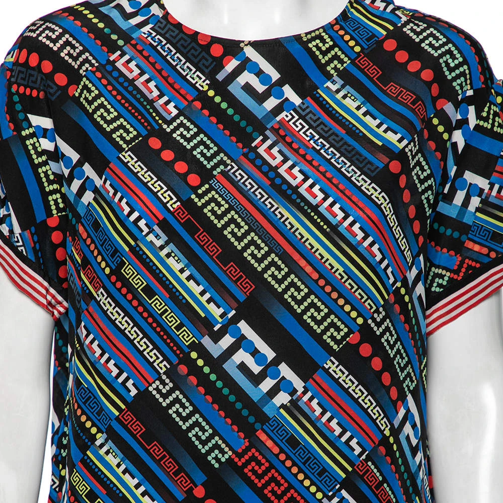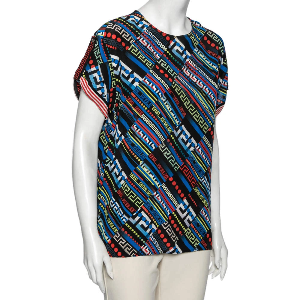 This blouse from Versace is made to offer a versatile style. It is stitched using multicolored La Greca printed silk fabric and has a crew neck and short sleeves. It comes with a buttoned closure. Sport a comoftable style as you wear this trendy top.