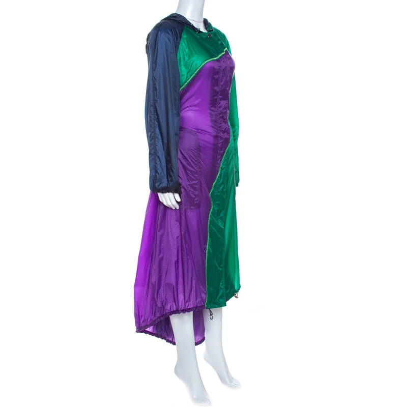 This raincoat is from Versace’s Spring 2017 Ready-To-Wear collection. Made from nylon, the coat comes in a design of multiple colours, long sleeves and a hood. It has a high-low hemline, zip closure and two pockets.