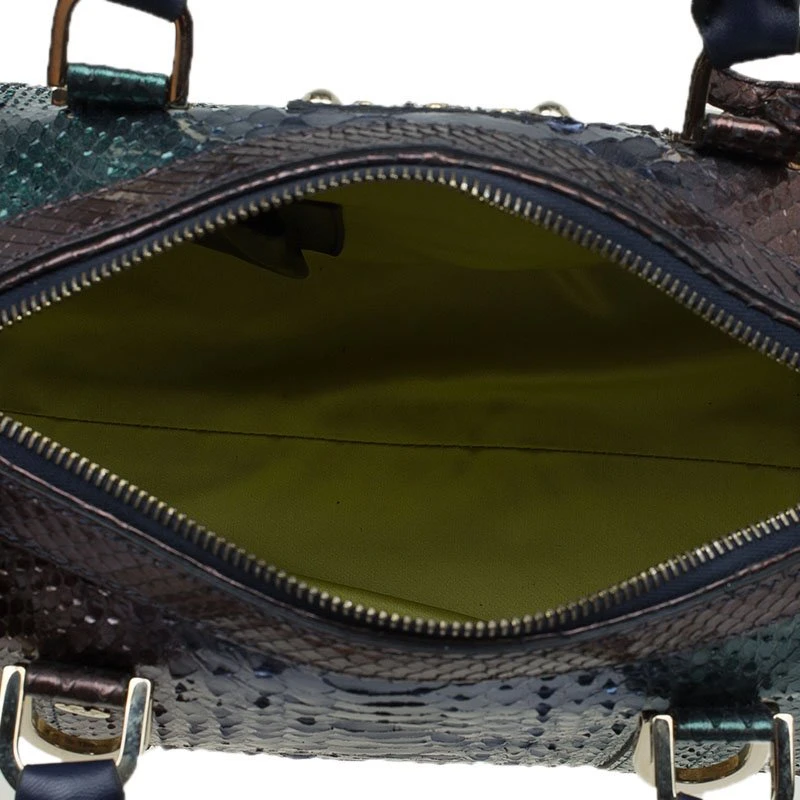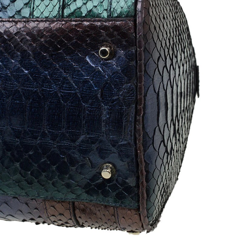 An attention-getter, Versace’s Madonna bowler bag is crafted from multicoloured python leather accented with gold-tone hardware and blue leather trim. It has two short handles making it easier to carry it in the crook of your arm.