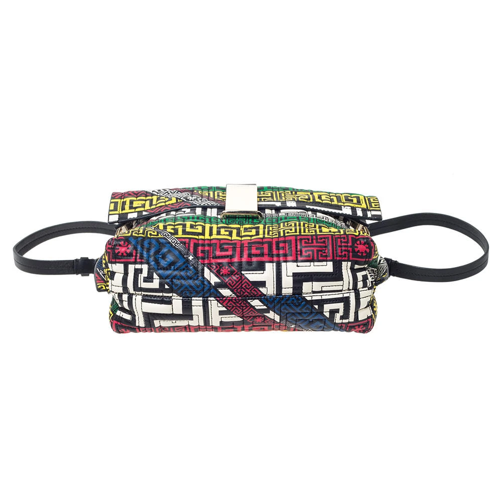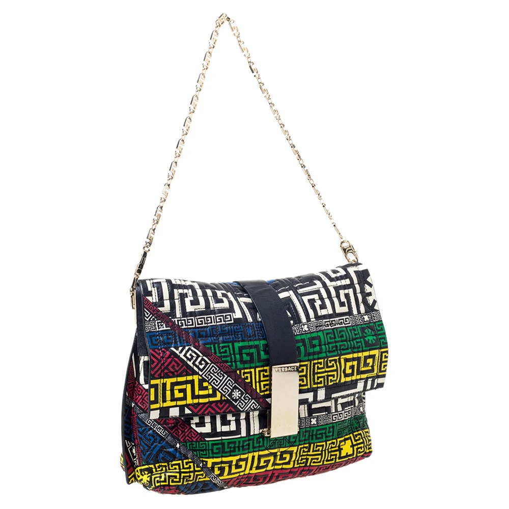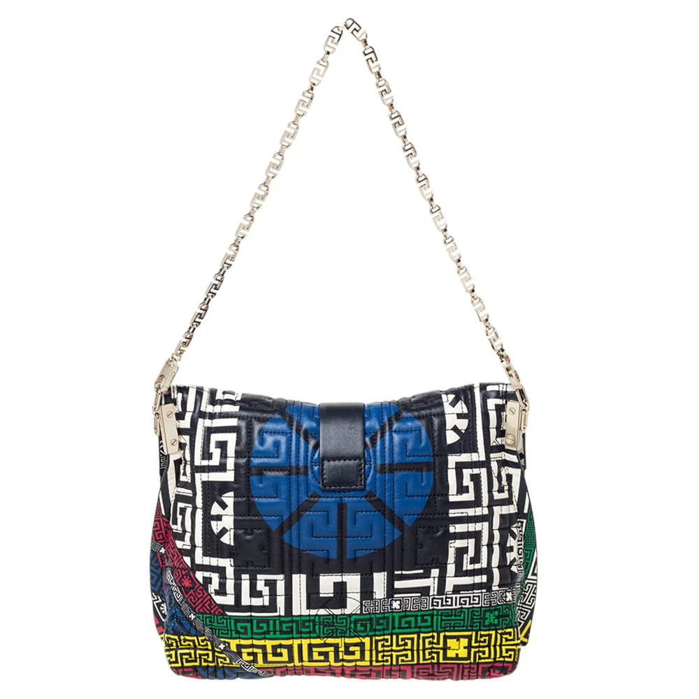 Look stylish and fancy in this Versace crossbody bag. Shaped in quilted leather, this bag is designed with a front flap and a chainlink shoulder strap. The standard leather lining on the interior ensures the durability of this bag. Be bold and be marvellous with this multicoloured bag that is ideal for you.