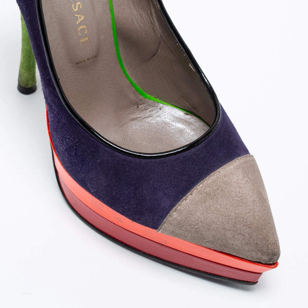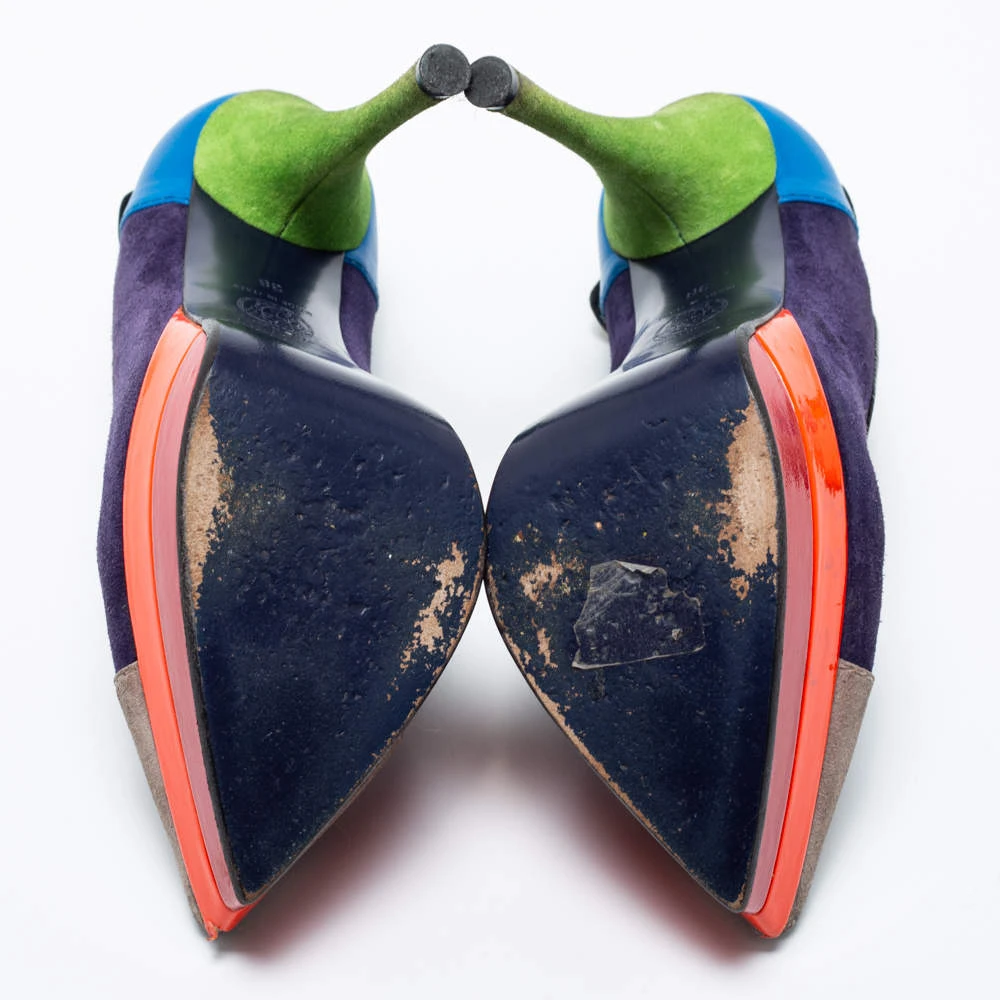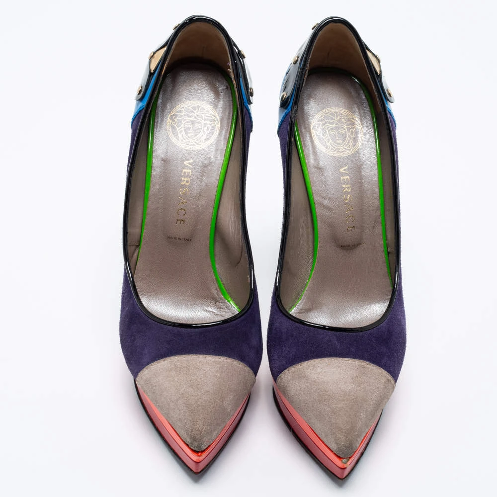 Crafted using multicolor suede and leather, these Versace pumps are meant to add a sophisticated finish to your look of the day. The designer pumps feature pointed toes, low platforms, and 14 cm heels.