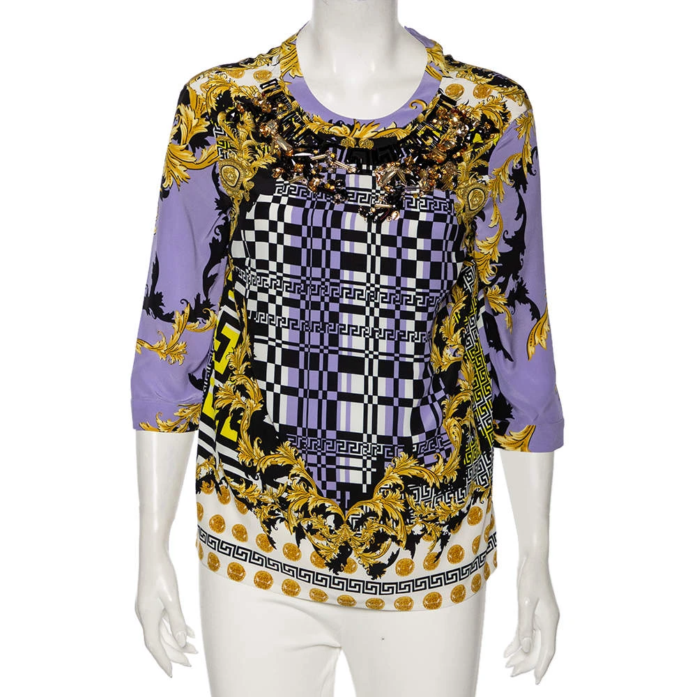 Versace is always the go-to option to pick unique, fancy pieces that grant your ensemble a magical touch. Flaunting a multicolored Baroque print on the silk fabric with embellishments near the neckline, this blouse from Versace is nothing less than a masterpiece. Complete your look by pairing it with jeans and flats.