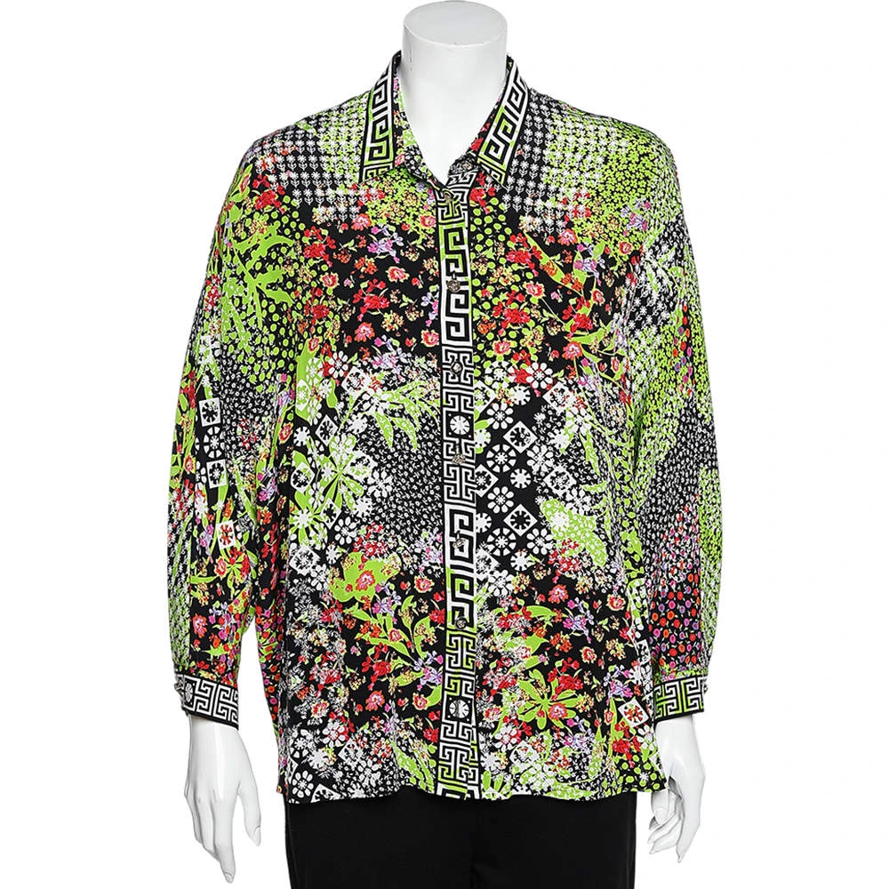 Known for its quirky and vibrant prints, this blouse from the House of Versace will bring its signature aesthetic to your wardrobe with complete ease. It is made from multicolored printed cotton and comes with a button-front feature, an oversized fit, and long sleeves.